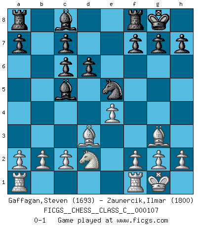 Last move : 0-1 2009 June 30 21:17:30 [Event "FICGS__CHESS__CLASS_C__000107"] [Site "FICGS"] [Date "2009.02.26"] [Round "1"] [White "Gaffagan,Steven"] [Black "Zaunercik,Ilmar"] [Result "0-1"] [WhiteElo "1693"] [BlackElo "1800"] 1.e4 e5 2.Nf3 Nc6 3.d4 exd4 4.Nxd4 Bc5 5.Nxc6 bxc6 6.Bd3 Qh4 7.O-O Nf6 8.Qf3 O-O 9.Bf4 d6 10.Bg3 Qg4 11.Qxg4 Nxg4 12.Nd2 Ne5 0-1 This chess game has been lost on time (started : 2009.02.26 22:3:32) Scotch game Kingside Castling by player White (move 7) Kingside Castling by player Black (move 8) Player Black won this chess game. Follow this game move after move (download)Chess, like any creative activity, can exist only through the combined efforts of those who have creative talent, and those who have the ability to organize their creative work. (Mikhail Botvinnik) Bis jetzt ist Weiß einer wohlbekannten Analyse gefolgt. Aber jetzt begeht er einen schrecklichen Fehler: Er beginnt seinen eigenen Kopf zu benutzen. (Siegbert Tarrasch) Los errores estan ahí, esperando a que se cometan. (Savielly Tartakower) La guerre est enfant de la passion, la passion est enfant du narcissisme et le narcissisme est l'enfant. (...) Une autre partie ? (Thibault de Vassal) Man with more than one clock never knows what time it is. (Chinese thought)