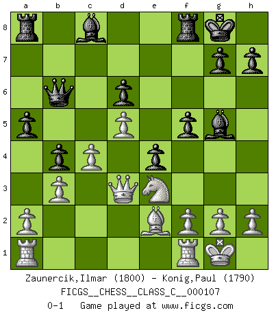 Last move : 0-1 2009 July 15 22:54:24 [Event "FICGS__CHESS__CLASS_C__000107"] [Site "FICGS"] [Date "2009.02.26"] [Round "1"] [White "Zaunercik,Ilmar"] [Black "Konig,Paul"] [Result "0-1"] [WhiteElo "1800"] [BlackElo "1790"] 1.e4 c5 2.Nf3 Nc6 3.d4 cxd4 4.Nxd4 Nf6 5.Nc3 e5 6.Ndb5 d6 7.Bg5 a6 8.Na3 b5 9.Nd5 Be7 10.Bxf6 Bxf6 11.c3 O-O 12.Be2 Bg5 13.O-O Ne7 14.c4 Nxd5 15.exd5 b4 16.Nc2 a5 17.Ne3 Qb6 18.Qd3 f5 19.b3 e4 0-1 This chess game has been lost on time (started : 2009.02.26 22:3:32) Sicilian : Pelikan (Lasker/Sveshnikov) variation Kingside Castling by player Black (move 11) Kingside Castling by player White (move 13) Player Black won this chess game. Follow this game move after move (download)The Pin is mightier than the sword. (Fred Reinfeld) Wer wird heute Abend ihr Gegner sein? -- Heute Abend spiele ich gegen die schwarzen Steine. (Akiba Rubinstein) El Ajedrez es como la guerra en un tablero. (Bobby Fischer) La vie et les Echecs sont tous les deux une lutte constante. (Lasker) There will be no order, only chaos. (Sol Robeson in Pi by Darren Aronofsky)