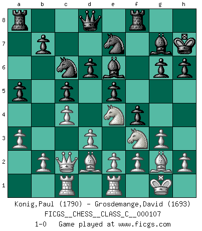 Last move : 1-0 2009 July 4 9:47:11 [Event "FICGS__CHESS__CLASS_C__000107"] [Site "FICGS"] [Date "2009.02.26"] [Round "1"] [White "Konig,Paul"] [Black "Grosdemange,David"] [Result "1-0"] [WhiteElo "1790"] [BlackElo "1693"] 1.c4 c5 2.Nc3 g6 3.g3 Nc6 4.Bg2 Bg7 5.Nf3 e5 6.d3 Nge7 7.O-O O-O 8.Rb1 a5 9.Bd2 d6 10.Re1 Be6 11.Ng5 Bc8 12.Qc1 h6 13.Nf3 Kh7 14.Qc2 Be6 15.a3 f5 16.Rbc1 f4 17.Ne4 1-0 This chess game has been lost on time (started : 2009.02.26 22:3:32) English : Symmetrical variation Kingside Castling by player White (move 7) Kingside Castling by player Black (move 7) Player White won this chess game. Follow this game move after move (download)One doesn't have to play well, it's enough to play better than your opponent. (Siegbert Tarrasch) Dieses schreckliche Gefühl, dass ich gegen eine Maschine spielte, die niemals Fehler macht, zerschmetterte meinen Widerstand. (Mark Taimanov) No solamente yo pronostico su triunfo sobre Botvinnik, sino que me adelanto y digo que probablemente Fischer es el jugador de Ajedrez mas grande que haya existido. (John Collins) Ne tendez aucun piège pour le plaisir ! Ne jouez rien dans l'espoir que l'adversaire réagisse de façon stupide ! Prenez toujours pour acquis que l'adversaire va trouver le meilleur coup ! Ne jouez jamais de coup dans l'espoir que l'adversaire ne voie pas la menace ! Chacun de vos coups doit améliorer la position d'une façon ou d'une autre. Even the best needles are not sharp at both ends. (Chinese proverb)