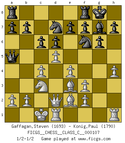 Last move : 1/2-1/2 2009 July 1 9:12:2 [Event "FICGS__CHESS__CLASS_C__000107"] [Site "FICGS"] [Date "2009.02.26"] [Round "1"] [White "Gaffagan,Steven"] [Black "Konig,Paul"] [Result "1/2-1/2"] [WhiteElo "1693"] [BlackElo "1790"] 1.c4 Nf6 2.Nc3 g6 3.e4 Nc6 4.d4 d6 5.Nf3 Bg4 6.Be3 Bg7 7.Be2 O-O 8.d5 Bxf3 9.gxf3 Ne5 10.h4 Ned7 11.Qd2 c6 12.O-O-O Qa5 1/2-1/2 English Opening Kingside Castling by player Black (move 7) Queenside Castling by player White (move 12) This chess game ended in a draw. Follow this game move after move (download)Chess is a fighting game which is purely intellectual and includes chance. (Richard Reti) Das Spiel gibt uns die Genugtuung, die das Leben uns versagt. (Emanuel Lasker) A través de las casillas del tablero, los Indios explican el movimiento del tiempo y la edad, las influencias mas altas que controlan el mundo y los lazos que vinculan al Ajedrez con el alma humana. (Al-Masudi) L'ordinateur a tué l'originalité. Il n'y a plus guère d'aventures sur l'échiquier. (Jacob Murray) The general who wins the battle makes many calculations in his temple before the battle is fought. The general who loses makes but few calculations beforehand. (Sun Tzu)