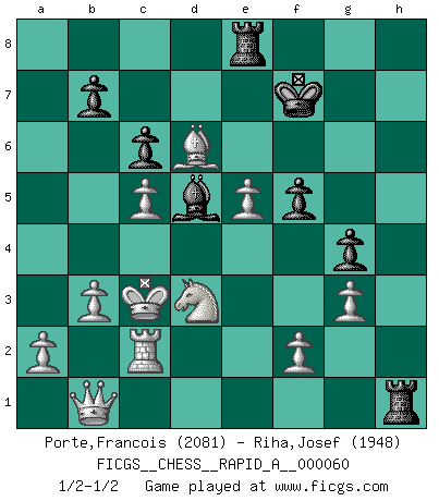 Last move : 1/2-1/2 2009 April 27 16:57:37 [Event "FICGS__CHESS__RAPID_A__000060"] [Site "FICGS"] [Date "2009.02.27"] [Round "1"] [White "Porte,Francois"] [Black "Riha,Josef"] [Result "1/2-1/2"] [WhiteElo "2081"] [BlackElo "1948"] 1.Nf3 Nf6 2.c4 c6 3.Nc3 d6 4.d4 Nbd7 5.e4 e5 6.Be2 Be7 7.O-O O-O 8.Be3 h6 9.Qc2 Ng4 10.Bd2 a5 11.h3 Ngf6 12.Be3 exd4 13.Nxd4 Nc5 14.Rad1 Qc7 15.Rd2 a4 16.Rfd1 Qa5 17.Bf3 Re8 18.Bf4 Nh7 19.h4 g5 20.hxg5 hxg5 21.Bg3 g4 22.Be2 Bg5 23.Bd3 Bxd2 24.Qxd2 Nxd3 25.Qxd3 Rd8 26.Nde2 Qh5 27.Bxd6 Qg6 28.c5 Nf6 29.Qd4 a3 30.b3 Re8 31.Ng3 Nh5 32.Nce2 Nxg3 33.Nxg3 f5 34.e5 Be6 35.Ne2 Rad8 36.Nf4 Qh7 37.Kf1 Bf7 38.Ke2 Qh6 39.g3 Qh8 40.Qa1 Qg7 41.Qc3 Qh8 42.Qd4 Rd7 43.Rc1 Be6 44.Kd3 Rh7 45.Qb4 Rh1 46.Qxa3 Kf7 47.Kc3 Qh2 48.Nd3 Bd5 49.Rc2 Qg1 50.Qb2 Qb1 51.Qxb1 1/2-1/2 Reti Opening Kingside Castling by player White (move 7) Kingside Castling by player Black (move 7) This chess game ended in a draw. Follow this game move after move (download)All I want to do, ever, is just play Chess. (Bobby Fischer) Fischer ist das größte Genie, das je vom Schachhimmel heruntergestiegen ist. (Mikhail Nekhemyevich Tal) De eso se trata el Ajedrez. Un día le das una lección a tu oponente y al día siguiente el te da una a tí. (Bobby Fischer) Toute estimation doit être constamment réévaluée. (Jacob Estrin) Warrior pose battles inner weakness and wins focus. You see that there is no war within you. You're on your own side, and you are your own strength. (Terri Guillemets)