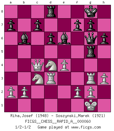 Last move : 1/2-1/2 2009 March 2 18:53:15 [Event "FICGS__CHESS__RAPID_A__000060"] [Site "FICGS"] [Date "2009.02.27"] [Round "1"] [White "Riha,Josef"] [Black "Soszynski,Marek"] [Result "1/2-1/2"] [WhiteElo "1948"] [BlackElo "1921"] 1.e4 e5 2.Nf3 Nc6 3.Bb5 Nf6 4.d3 Bc5 5.c3 O-O 6.Bg5 d6 7.Bxc6 bxc6 8.O-O h6 9.Bxf6 Qxf6 10.Qa4 Bd7 11.d4 exd4 12.cxd4 Bb6 13.Re1 Rfe8 14.Nc3 Rad8 15.Rad1 Qg6 16.Re3 c5 17.Qc4 cxd4 18.Nxd4 Qh5 19.h3 Re5 20.Rf3 Rg5 21.R1d3 Qg6 22.Rg3 Be6 23.Qa4 Bd7 24.Qc4 Be6 1/2-1/2 Ruy Lopez : Berlin defense Kingside Castling by player Black (move 5) Kingside Castling by player White (move 8) This chess game ended in a draw. Follow this game move after move (download)You sit at the board and suddenly your heart leaps. Your hand trembles to pick up the piece and move it. But what Chess teaches you is that you must sit there calmly and think about whether it's really a good idea and whether there are other better ideas. (Stanley Kubrick) Moralische Siege zählen nicht. (Savielly Grigorievitsch Tartakower) Tu cuerpo tiene que estar en óptima condición. Tu Ajedrez se deteriora como lo hace tu cuerpo. No puedes separar la mente y el cuerpo. (Bobby Fischer) Les Echecs ne sont pas pour les âmes timides. Ils requièrent un homme entier, qui ne s'arrête pas aveuglément à ce qui a été déjà établi, mais qui tente individuellement de sonder les profondeurs du jeu. (W. Steinitz) You can only get smarter by playing a smarter opponent. (Revolver, movie)