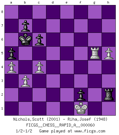 Last move : 1/2-1/2 2009 March 2 9:42:39 [Event "FICGS__CHESS__RAPID_A__000060"] [Site "FICGS"] [Date "2009.02.27"] [Round "1"] [White "Nichols,Scott"] [Black "Riha,Josef"] [Result "1/2-1/2"] [WhiteElo "2001"] [BlackElo "1948"] 1.e4 d6 2.d4 Nf6 3.Nc3 e5 4.dxe5 dxe5 5.Qxd8+ Kxd8 6.Bg5 Be6 7.O-O-O Nbd7 8.f4 exf4 9.Nf3 h6 10.Bxf4 c6 11.Nd4 Bb4 12.e5 Bxc3 13.exf6 Bxd4 14.Rxd4 gxf6 15.Be2 Kc8 16.Rhd1 a5 17.a4 Nc5 18.Bf3 Nd7 19.Re1 Ne5 20.Bxe5 fxe5 21.Rxe5 Kc7 22.Rh5 f5 23.Rdh4 Rad8 24.Rxh6 Rhe8 25.b3 Bd5 26.Rd4 Bxf3 27.Rh7+ Kb6 28.Rxd8 Rxd8 29.gxf3 Rd4 30.h4 Rf4 31.h5 Rxf3 32.Rf7 f4 33.Kd2 Rh3 34.Rf5 Rh2+ 35.Kd3 f3 36.c4 f2 37.Ke2 Ka6 38.Kf1 Kb6 39.Rg5 1/2-1/2 Pirc defense Queenside Castling by player White (move 7) This chess game ended in a draw. Follow this game move after move (download)A Chess game is a dialogue, a conversation between a player and his opponent. Each move by the opponent may contain threats or be a blunder, but a player cannot defend against threats or take advantage of blunders if he does not first ask himself: What is my opponent planning after each move ? (Bruce A. Moon) Ich bin der einzige Schachspieler, der sich während der Vorbereitungen zum Turnier verletzt hat. (Woody Allen) Sin errores no puede haber brillantez. (Emanuel Lasker) Vous savez, camarade Pachman, je n'éprouve pas de plaisir à être ministre, je jouerais plutôt aux échecs comme vous, ou alors ferais une révolution au Venezuela. (Che Guevara à Ludek Pachman, 'Checkmate in Prague', 1975) God, you are such an idiot. - Actually, I thought I was more of a jerk. (Gregory House to Stacy Warner, House M.D.)