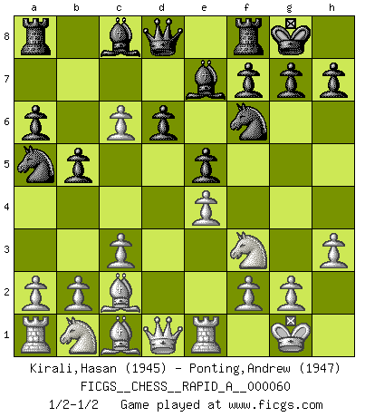 Last move : 1/2-1/2 2009 March 31 0:12:34 [Event "FICGS__CHESS__RAPID_A__000060"] [Site "FICGS"] [Date "2009.02.27"] [Round "1"] [White "Kirali,Hasan"] [Black "Ponting,Andrew"] [Result "1/2-1/2"] [WhiteElo "1945"] [BlackElo "1947"] 1.e4 e5 2.Nf3 Nc6 3.Bb5 a6 4.Ba4 Nf6 5.O-O Be7 6.Re1 b5 7.Bb3 d6 8.c3 O-O 9.d4 Bg4 10.d5 Na5 11.Bc2 c6 12.h3 Bc8 13.dxc6 1/2-1/2 Ruy Lopez : Closed Kingside Castling by player White (move 5) Kingside Castling by player Black (move 8) This chess game ended in a draw. Follow this game move after move (download)The older I grow, the more I value pawns. (Paul Keres) Es ist peinlich, dass ich nie Weltmeister wurde. Es wäre leicht, Leonid Breschnjew als Ursache vorzuschieben, dessen Apparat den Vorzeigekommunisten Anatoli Karpow in allem unterstützte. Aber Garri Kasparow zum Beispiel, der ebenfalls von den Sowjets unerwünscht war, hat trotz der Widerstände den WM-Titel erobert. (Viktor Kortschnoi) Fischer es el jugador mas fuerte del mundo. De hecho, el jugador mas fuerte que jamas haya existido. (Larry Evans) La victoire dans une partie d'Echecs appartient la plupart du temps à celui qui voit un peu plus loin que l'adversaire. (Lasker) Luck has a peculiar habit of favoring those who don't depend on it. (Author unknown)