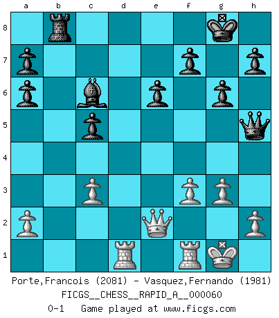 Last move : 0-1 2009 June 8 7:28:44 [Event "FICGS__CHESS__RAPID_A__000060"] [Site "FICGS"] [Date "2009.02.27"] [Round "1"] [White "Porte,Francois"] [Black "Vasquez,Fernando"] [Result "0-1"] [WhiteElo "2081"] [BlackElo "1981"] 1.Nf3 Nf6 2.c4 g6 3.Nc3 Bg7 4.e4 c5 5.d4 Qa5 6.Bd2 cxd4 7.Nxd4 O-O 8.Be2 Nxe4 9.Nxe4 Qe5 10.Nb5 Qxe4 11.Nc7 Na6 12.f3 Qh4+ 13.g3 Qh3 14.Bf1 Qh5 15.Nxa8 d6 16.c5 dxc5 17.Bc4 Bd7 18.Bc3 Bxc3+ 19.bxc3 Bc6 20.O-O Rxa8 21.Qe2 e6 22.Bxa6 bxa6 23.Rad1 Rb8 0-1 This chess game has been lost on time (started : 2009.02.27 12:1:56) Reti Opening Kingside Castling by player Black (move 7) Kingside Castling by player White (move 20) Player Black won this chess game. Follow this game move after move (download)You know, comrade Pachman, I don't enjoy being a Minister, I would rather play Chess like you. (Che Guevara) Warum muß ich gegen diesen IDIOTEN verlieren? (Aaron Nimzowitsch) El Ajedrez moderno está demasiado preocupado con cosas como la estructura de Peones. Olvidenlo, el Jaque Mate termina la partida. (Nigel Short) Que feriez-vous si vous étiez en train de jouer aux échecs et que la fin du monde arrive ? Je continuerais à jouer. (Saint Borromée) To steal ideas from one person is plagiarism. To steal from many is research. (Unknown)