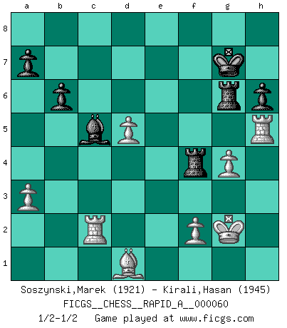 Last move : 1/2-1/2 2009 March 20 14:11:44 [Event "FICGS__CHESS__RAPID_A__000060"] [Site "FICGS"] [Date "2009.02.27"] [Round "1"] [White "Soszynski,Marek"] [Black "Kirali,Hasan"] [Result "1/2-1/2"] [WhiteElo "1921"] [BlackElo "1945"] 1.Nf3 c5 2.c4 Nc6 3.g3 g6 4.Bg2 Bg7 5.Nc3 e5 6.a3 d6 7.O-O Nge7 8.b4 e4 9.Ng5 f5 10.Bb2 h6 11.Nh3 Be6 12.d3 g5 13.Qb1 O-O 14.Rd1 Nd4 15.dxe4 f4 16.bxc5 f3 17.exf3 dxc5 18.Nd5 Qd7 19.g4 Ng6 20.Kh1 Rf7 21.Ng1 Qa4 22.Bxd4 Bxd4 23.Ra2 Qxc4 24.Ne2 Be5 25.Rc1 Qa6 26.Rxc5 Rd8 27.Qb3 Bxh2 28.Nd4 Bb8 29.Kg1 Nh4 30.Nxe6 Qxe6 31.Rd2 Qe5 32.Kf1 b6 33.Rc6 Kg7 34.Rd3 Qa1+ 35.Qd1 Qe5 36.Qd2 Ng6 37.Qd1 Rfd7 38.f4 gxf4 39.Rh3 Rd6 40.Rc2 f3 41.Bxf3 Nf4 42.Rh1 Rf6 43.Rd2 Nxd5 44.exd5 Bd6 45.Kg2 Bc5 46.Rc2 Rdf8 47.Rh5 Qd4 48.Qc1 Rg6 49.Qd1 Qxd1 50.Bxd1 Rf4 1/2-1/2 Reti Opening Kingside Castling by player White (move 7) Kingside Castling by player Black (move 13) This chess game ended in a draw. Follow this game move after move (download)Good offense and good defense both begin with good development. (Bruce A. Moon) Die Neutralität betrachte ich als eine schwere Krankheit. (Viktor Kortschnoi) Diferente gente reacciona diferentemente en aceptar la derrota. (Bobby Fischer) Les réformistes prétendent que les progrès de la théorie conduiront à la disparition des échecs, et qu'il faut, pour leur rendre vie, en remanier les règles. En réalité, qu'exprime cette affirmation? Le mépris de l'intuition, de l'imagination et de tous les autres éléments qui font des échecs un art. (Alexander Alekhine) A journey of a thousand sites begins with a single click. (Author unknown)