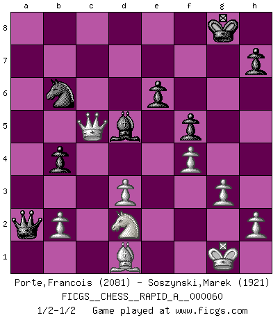 Last move : 1/2-1/2 2009 April 26 21:15:51 [Event "FICGS__CHESS__RAPID_A__000060"] [Site "FICGS"] [Date "2009.02.27"] [Round "1"] [White "Porte,Francois"] [Black "Soszynski,Marek"] [Result "1/2-1/2"] [WhiteElo "2081"] [BlackElo "1921"] 1.Nf3 d5 2.c4 e6 3.g3 dxc4 4.Qa4+ Nd7 5.Qxc4 a6 6.Bg2 b5 7.Qc6 Rb8 8.Qc2 Bb7 9.O-O c5 10.d3 Ngf6 11.Bf4 Ra8 12.Nc3 Be7 13.a4 Qb6 14.axb5 axb5 15.Qb3 b4 16.Rxa8+ Bxa8 17.Ra1 O-O 18.Nd1 Bd5 19.Qc2 Ra8 20.Rxa8+ Bxa8 21.e4 Qa6 22.Nd2 Ne8 23.Be3 Bc6 24.f4 Nc7 25.Bf1 Qa2 26.Nf2 Bf6 27.e5 Be7 28.Nfe4 Nd5 29.Bf2 N5b6 30.Be2 f6 31.exf6 gxf6 32.Bf3 Bd5 33.Bd1 f5 34.Nxc5 Nxc5 35.Bxc5 Bxc5+ 36.Qxc5 1/2-1/2 Reti Opening Kingside Castling by player White (move 9) Kingside Castling by player Black (move 17) This chess game ended in a draw. Follow this game move after move (download)Bobby Fischer is the greatest Chess player who has ever lived. (Ken Smith) Im Internet Chess Club betrug mein Rating vorübergehend 3350 ELO-Punkte. (Sergej Karjakin) Alguna parte de un error es siempre correcto. (Savielly Tartakover) Les Echecs ont trois composantes : le temps, l'espace et le matériel en dernier. (Mikhail Tal) If you work for a living, why do you kill yourself working ? (Tuco to a chicken in The Good, The Bad and The Ugly)