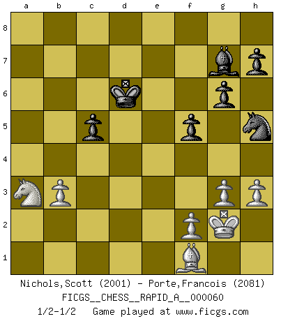 Last move : 1/2-1/2 2009 April 18 16:0:40 [Event "FICGS__CHESS__RAPID_A__000060"] [Site "FICGS"] [Date "2009.02.27"] [Round "1"] [White "Nichols,Scott"] [Black "Porte,Francois"] [Result "1/2-1/2"] [WhiteElo "2001"] [BlackElo "2081"] 1.e4 c5 2.d4 cxd4 3.Nf3 d6 4.c3 Nf6 5.cxd4 Nxe4 6.Bd3 Nf6 7.O-O g6 8.Nc3 Bg7 9.Qb3 O-O 10.Re1 Nc6 11.d5 Nb8 12.Be3 Nbd7 13.Bf1 Nc5 14.Qa3 Bg4 15.Ne5 Rc8 16.Nc4 a6 17.h3 b5 18.Ne5 Bd7 19.Rad1 Nh5 20.Nc6 Bxc6 21.dxc6 Rxc6 22.Nd5 Re8 23.Nb4 Rc8 24.Bxc5 Rxc5 25.Qxa6 Qd7 26.Rd5 Qc8 27.Rxc5 dxc5 28.Qxc8 Rxc8 29.Nd5 Rb8 30.Nxe7+ Kf8 31.Nc6 Rb6 32.Ne5 Rb7 33.b3 Re7 34.Nf3 Rxe1 35.Nxe1 b4 36.g3 Ke7 37.Nc2 Kd6 38.a4 bxa3 39.Nxa3 f5 40.Kg2 1/2-1/2 Sicilian : Smith-Morra gambit Kingside Castling by player White (move 7) Kingside Castling by player Black (move 9) This chess game ended in a draw. Follow this game move after move (download)It began to feel as though you were playing against Chess itself. - On playing against Robert Fischer. (Walter Shipman) Man wirke der falschen Auffassung entgegen, als ob jeder Zug Unmittelbares zu leisten habe; auch Werte- und Ruhezüge haben ihre Existenzberechtigung. (Aaron Nimzowitsch) ¿Cual es el objetivo de jugar una apertura de gambito?... Para adquirir una reputación de ser un jugador apuesto a costo de perder el juego. (Siegbert Tarrasch) L'ordinateur a tué l'originalité. Il n'y a plus guère d'aventures sur l'échiquier. (Jacob Murray) Thus, what is of supreme importance in war is to attack the enemy's strategy. (Sun Tzu)