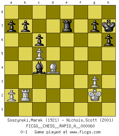 Last move : 0-1 2009 March 8 23:43:12 [Event "FICGS__CHESS__RAPID_A__000060"] [Site "FICGS"] [Date "2009.02.27"] [Round "1"] [White "Soszynski,Marek"] [Black "Nichols,Scott"] [Result "0-1"] [WhiteElo "1921"] [BlackElo "2001"] 1.Nf3 Nf6 2.c4 c6 3.g3 d5 4.b3 dxc4 5.bxc4 e5 6.Bg2 Bd6 7.O-O O-O 8.Bb2 Qe7 9.d3 Na6 10.Nbd2 Re8 11.Rb1 Bf5 12.Nh4 Be6 13.Bc3 Rad8 14.Qc2 h6 15.Rfd1 Bc8 16.Ne4 Nxe4 17.Bxe4 Bb4 18.Bb2 Bg4 19.Nf5 Qf6 20.Ne3 Bh3 21.Qa4 Bc5 22.Ba3 Bxe3 23.fxe3 Qg5 24.Kf2 Rd7 25.Qc2 f5 26.Bf3 f4 27.exf4 exf4 28.Qd2 Rf7 29.Kg1 Qg6 30.Qe1 Re5 31.Bb2 fxg3 32.hxg3 Re3 33.Qf2 Nc5 34.Bd4 Rexf3 35.exf3 Nxd3 36.Rxd3 Qxd3 37.Rb3 Qd1+ 38.Kh2 Bg4 39.Qg1 Qe2+ 40.Qf2 Bxf3 41.Qxe2 Bxe2 42.c5 Bc4 43.Rb2 Re7 44.Kg2 Kh7 0-1 Reti Opening Kingside Castling by player White (move 7) Kingside Castling by player Black (move 7) Player Black won this chess game. Follow this game move after move (download)The most important feature of the Chess position is the activity of the pieces. This is absolutely fundamental in all phases of the game: Opening, Middlegame and especially Endgame. The primary constraint on a piece's activity is the Pawn structure. (Michael Stean) Rubinstein ist ein Turmendspiel, welches die Götter vor tausenden von Jahren begannen. (Savielly Grigorievitsch Tartakower) Sin errores no puede haber brillantez. (Emanuel Lasker) Dans le domaine de la peinture, de la gravure et de la sculpture, dès la première décennie de notre siècle, les artistes abandonnent la représentation de la partie d'échecs pour se concentrer sur les pièces, sur les échiquiers et sur toutes les variations auxquelles les unes et les autres peuvent donner lieu. On passe en quelque sorte d'un thème social à un thème musical (au sens de la musica médiévale, c'est-à-dire d'une notion qui inclue le rythme, l'harmonie, la construction et la déconstruction, etc.). Graphiquement et picturalement, l'échiquier apparaît comme une structure ouverte, dynamique, d'une richesse infinie, autorisant toutes les combinatoires et débouchant sur des mouvements et des rythmes de nature exponentielle. (Michel Pastoureau) Those parts of the system that you can hit with a hammer (not advised) are called hardware; those program instructions that you can only curse at are called software. (Anonymous)
