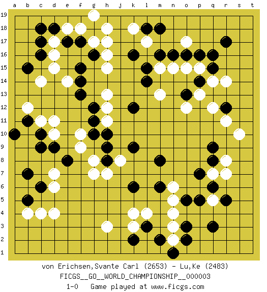 Last move : 1-0 2009 August 27 9:34:1 [Event "FICGS__GO__WORLD_CHAMPIONSHIP__000003"] [Site "FICGS"] [Date "2009.02.28"] [Round "1"] [Black "von Erichsen,Svante Carl"] [White "Lu,Ke"] [Result "1-0"] [Rating 1 "2653"] [Rating 2 "2483"] 1.q16 d4 2.q3 d16 3.f17 c14 4.k16 q5 5.q8 n4 6.o5 n5 7.p5 h3 8.o3 n3 9.c6 c4 10.c9 r14 11.r12 o17 12.r17 p15 13.q15 q14 14.p14 q12 15.p16 o15 16.o16 n15 17.n16 m15 18.m16 r11 19.f15 h15 20.l15 m13 21.l14 h13 22.k12 h17 23.f13 h11 24.c17 d17 25.c16 d15 26.d18 e18 27.c18 f18 28.b15 d10 29.c10 d11 30.e8 d7 31.b7 d6 32.d9 g7 33.g12 h12 34.g10 e14 35.f14 f10 36.g11 f9 37.g16 h16 38.e17 c11 39.b11 g17 40.h9 b12 41.k9 k18 42.l18 l17 43.m18 h18 44.h10 g19 45.a10 g8 46.b5 b4 47.k6 j8 48.h8 h7 49.m6 n6 50.m8 k4 51.o13 p13 52.o2 q7 53.p7 r8 54.q6 r7 55.r5 o12 56.q9 s10 57.l3 l4 58.m2 n2 59.n1 k3 60.k2 1-0 This go game has been lost on time (started : 2009.02.28 3:6:11) Here are the names of the openings (joseki) played in the four corners : Corner d16 : d16 f17 Hoshi (Hwajeom, Seongjeom, Xingwei`) 4-4 Point. The star or hoshi (4-4) point, emphasizing influence at the potential expense of territory. Ikken Kakari (Hankan Keolch'im, Yi Gua`jiao~, 1-Space Low Approach). Black 2 is the standard approach move to the 4-4. Corner q4 : q3 q5 Komoku (Somok, Xiao~mu`) 3-4 Point. The komoku (3-4) point is the traditional corner enclosure move.. Ikken Takagakari (Hankan Nop'dakeolch'im, Yi Gaogua`jiao~, 1-Space High Approach). The 5-4 approach move has become more popular in modern times, as modern Go emphasizes speed and influence. Corner q16 : q16 r14 Hoshi (Hwajeom, Seongjeom, Xingwei`) 4-4 Point. The star or hoshi (4-4) point, emphasizing influence at the potential expense of territory. Ikken Kakari (Hankan Keolch'im, Yi Gua`jiao~, 1-Space Low Approach). White 2 is the standard approach move to the 4-4. Player Black won this Go (weiqi, baduk) game. Follow this game move after move (download)A few moments to learn, a lifetime to master. (Ancient proverb) The meaning of life is that it is to be lived, and it is not to be traded and conceptualized and squeezed into a pattern of systems. (Bruce Lee)