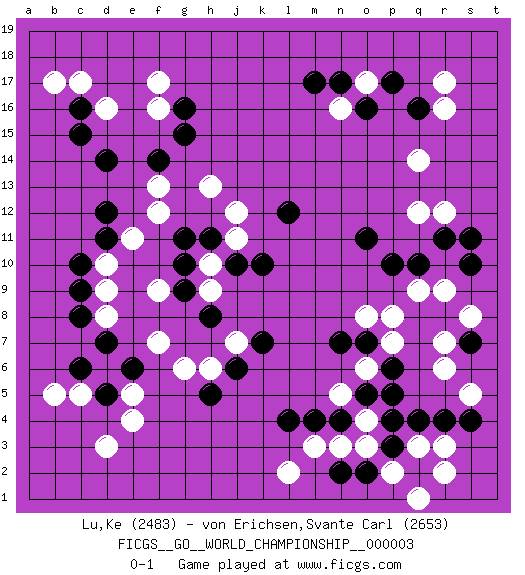 Last move : 0-1 2009 August 5 12:24:0 [Event "FICGS__GO__WORLD_CHAMPIONSHIP__000003 "] [Site "FICGS"] [Date "2009.02.28"] [Round "4"] [Black "Lu,Ke "] [White "von Erichsen,Svante Carl "] [Result "0-1"] [Rating 1 "2483"] [Rating 2 "2653"] 1.q16 d16 2.q4 d3 3.q10 o17 4.m17 q14 5.o16 n16 6.n17 r16 7.p17 r17 8.d5 e5 9.e6 e4 10.d7 c5 11.c6 b5 12.d14 f16 13.c16 c17 14.c15 b17 15.f14 o3 16.l4 r3 17.r4 q3 18.p4 o4 19.p3 p2 20.q2 r2 21.o2 q1 22.o5 n5 23.n4 n3 24.n2 m3 25.m4 o6 26.p5 l2 27.h5 h10 28.k10 h13 29.g16 f17 30.g15 f12 31.g11 f9 32.h11 j11 33.j10 d9 34.d11 g6 35.c9 h6 36.j6 j7 37.k7 d10 38.c10 e11 39.d12 j12 40.g10 h9 41.g9 f13 42.l12 d8 43.c8 f7 44.h8 r12 45.r11 q12 46.o11 r9 47.s11 q9 48.p10 s5 49.s4 r6 50.s7 r7 51.p6 p7 52.o7 s8 53.s10 o8 54.n7 p8 0-1 This go game has been lost on time (started : 2009.02.28 3:6:11) Here are the names of the openings (joseki) played in the four corners : Corner q16 : q16 o17Hoshi (Hwajeom, Seongjeom, Xingwei`) 4-4 Point. The star or hoshi (4-4) point, emphasizing influence at the potential expense of territory.Ikken Kakari (Hankan Keolch'im, Yi Gua`jiao~, 1-Space Low Approach). White 2 is the standard approach move to the 4-4. Corner d4 : d3 d5Komoku (Somok, Xiao~mu`) 3-4 Point. The komoku (3-4) point is the traditional corner enclosure move..Ikken Takagakari (Hankan Nop'dakeolch'im, Yi Gaogua`jiao~, 1-Space High Approach). The 5-4 approach move has become more popular in modern times, as modern Go emphasizes speed and influence. Corner d16 : d16 d14Hoshi (Hwajeom, Seongjeom, Xingwei`) 4-4 Point. The star or hoshi (4-4) point, emphasizing influence at the potential expense of territory.Ikken Takagakari (Hankan Nop'dakeolch'im, Yi Gaojia, 1-Space High Approach). White typically responds at 6-4 or 3-10. White 4-10 is played when White finds play on the right side advantageous. White 4-8 or 3-8 may be played when White has support at top. Corner q4 : q4 o3Hoshi (Hwajeom, Seongjeom, Xingwei`) 4-4 Point. The star or hoshi (4-4) point, emphasizing influence at the potential expense of territory.Ikken Kakari (Hankan Keolch'im, Yi Gua`jiao~, 1-Space Low Approach). White 2 is the standard approach move to the 4-4. Player White won this Go (weiqi, baduk) game.Follow this game move after move (download ) Beware of the clumsy double contact. (Anonymous) Shallow men believe in luck. Strong men belive in cause and effect. (Ralph Waldo Emerson)
