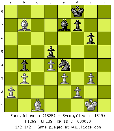 Last move : 1/2-1/2 2009 March 12 22:13:32 [Event "FICGS__CHESS__RAPID_C__000070"] [Site "FICGS"] [Date "2009.02.28"] [Round "1"] [White "Farr,Johannes"] [Black "Bromo,Alexis"] [Result "1/2-1/2"] [WhiteElo "1525"] [BlackElo "1519"] 1.d4 d5 2.c4 c6 3.Nf3 Nf6 4.e3 Bg4 5.Qb3 b6 6.Ne5 e6 7.cxd5 exd5 8.Nxg4 Nxg4 9.Be2 Nf6 10.Nc3 Be7 11.Qc2 Nbd7 12.O-O Qc7 13.b3 O-O 14.Bb2 g6 15.Rac1 a6 16.Na4 Ne4 17.Qxc6 Qxc6 18.Rxc6 b5 19.Nb6 Nxb6 20.Rxb6 Rfb8 21.Rxb8+ Rxb8 22.Rc1 Bh4 23.g3 Be7 24.Rc7 Kf8 25.Bg4 h5 26.Bc8 Rb6 27.Ra7 h4 28.Rxa6 Rxa6 29.Bxa6 b4 30.Bb7 Nf6 31.Bc1 hxg3 32.hxg3 Ne4 1/2-1/2 QGD Slav : 4.e3 Kingside Castling by player White (move 12) Kingside Castling by player Black (move 13) This chess game ended in a draw. Follow this game move after move (download)All that matters on the Chessboard is good moves. (Bobby Fischer) Später, ... hatte ich zunehmend Erfolg in entscheidenden Partien. Vielleicht weil ich eine einfache Wahrheit erkannte: nicht nur ich hatte Angst, auch mein Gegner. (Mikhail Nekhemyevich Tal) El Ajedrez se juega con la mente... ¡no con las manos!. (Renaud y Kahn) Si le désir cupide (et stupide) de gagner est une inépuisable source de souffrance, une combinaison brillante sur l'échiquier est une découverte : le coquelicot qui s'épanouit lorsque apparaît la Voie Lactée. (Arrabal) Waiting for chance ? Play in casinos. (FICGS proverb)
