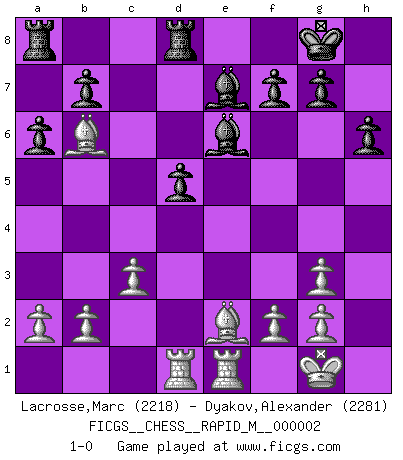 Last move : 1-0 2006 July 6 12:58:52 [Event "FICGS__CHESS__RAPID_M__000002"] [Site "FICGS"] [Date "2006.04.18"] [Round "1"] [White "Lacrosse,Marc"] [Black "Dyakov,Alexander"] [Result "1-0"] [WhiteElo "2218"] [BlackElo "2281"] 1.Nc3 d5 2.e4 c6 3.Qf3 Nf6 4.e5 Nfd7 5.Qg3 e6 6.Nf3 a6 7.d4 c5 8.dxc5 Nxc5 9.Be2 Nc6 10.O-O Qc7 11.Be3 Nd7 12.Rfe1 h6 13.Nxd5 exd5 14.e6 Qxg3 15.exd7+ Bxd7 16.hxg3 Be7 17.Rad1 Be6 18.c3 O-O 19.Nd4 Nxd4 20.Bxd4 Rfd8 21.Bb6 1-0 This chess game has been lost on time (started : 2006.04.18 16:37:24) Dunst (Sleipner, Heinrichsen) Opening Kingside Castling by player White (move 10) Kingside Castling by player Black (move 18) Player White won this chess game. Follow this game move after move (download)I still hope to kill Fischer. (Boris Spassky) Kasparov stellt für gewöhnlich die Regeln auf und bricht sie dann selbst wieder. (Alexej Shirov) Hay jugadores fuertes y personas amables y yo soy un jugador fuerte. (Bobby Fischer) Ce qui est bien, c'est d'avoir tout un tas de pièces en prise : l'adversaire ne peut en prendre qu'une à la fois. Cité par Thierry Audin. The question of whether computers can think is just like question of whether submarines can swim. (Edsger W. Dijkstra)