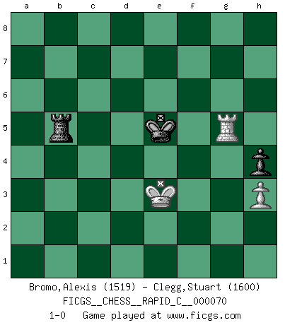 Last move : 1-0 2009 March 7 17:15:23 [Event "FICGS__CHESS__RAPID_C__000070"] [Site "FICGS"] [Date "2009.02.28"] [Round "1"] [White "Bromo,Alexis"] [Black "Clegg,Stuart"] [Result "1-0"] [WhiteElo "1519"] [BlackElo "1600"] 1.e4 Nf6 2.Nc3 e5 3.Nf3 Nc6 4.Bb5 Nd4 5.Nxe5 Qe7 6.Nf3 Nxb5 7.Nxb5 Qxe4+ 8.Qe2 Qxe2+ 9.Kxe2 Nd5 10.d4 f6 11.Re1 Kf7 12.c4 Nb4 13.Kd2 d5 14.c5 Bg4 15.a3 Nc6 16.Nxc7 Rc8 17.Nxd5 Bxf3 18.gxf3 Nxd4 19.Re3 Bxc5 20.Rd3 Ne6 21.Ne3 Ng5 22.Nf5 Nh3 23.Nd6+ Bxd6 24.Rxd6 Nxf2 25.Rd7+ Kg6 26.Rxb7 a5 27.Ke2 Nh3 28.Kf1 Rhd8 29.Kg2 Ng5 30.Bxg5 Kxg5 31.Rb5+ Kg6 32.Kh3 Rb8 33.Rxb8 Rxb8 34.Rb1 h5 35.Kg3 Kg5 36.b4 axb4 37.axb4 h4+ 38.Kf2 Kf4 39.Ke2 Ke5 40.Ke3 g5 41.b5 Rb6 42.Rb4 f5 43.h3 g4 44.fxg4 fxg4 45.Rxg4 Rxb5 46.Rg5+ 1-0 Alekhine's defense 10 pieces endgame at move 37 : White KRPPP , Black KRPPP WHITE : King + 1 Rook 3 Pawns BLACK : King + 1 Rook 3 Pawns 9 pieces endgame at move 44 : White KRPPP , Black KRPP WHITE : King + 1 Rook 3 Pawns BLACK : King + 1 Rook 2 Pawns 8 pieces endgame at move 44 : White KRPP , Black KRPP WHITE : King + 1 Rook 2 Pawns BLACK : King + 1 Rook 2 Pawns 7 pieces endgame at move 45 : White KRPP , Black KRP WHITE : King + 1 Rook 2 Pawns BLACK : King + 1 Rook 1 Pawn 6 pieces endgame at move 45 : White KRP , Black KRP WHITE : King + 1 Rook 1 Pawn BLACK : King + 1 Rook 1 Pawn Player White won this chess game. Follow this game move after move (download)Chess is really ninety nine percent calculation. (Soltis) Kann Schach nicht schließlich das Nationalspiel der Deutschen werden? Und welche weiteren Ausblicke bieten sich dann dar! Welche Hebung des allgemeinen Kultur-Niveaus, ja der Moral, wenn das Schachbrett den Kartentisch verdrängen würde! Wahrlich, ein Ziel, des Schweißes der Edlen wert! (Siegbert Tarrasch) Coloca el contenido de las piezas del Ajedrez en un sombrero, agitalo vigorosamente, arrojalas en un tablero desde una altura de 30 centimetros y así obtendras el estilo de Steinitz. (H. E. Bird) Que feriez-vous si vous étiez en train de jouer aux échecs et que la fin du monde arrive ? Je continuerais à jouer. (Saint Borromée) Begin at the beginning and go on till you come to the end; then stop. (Lewis Carrol, Alice in Wonderland)