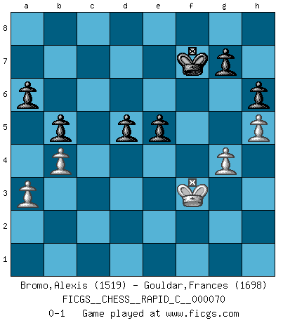 Last move : 0-1 2009 March 29 12:5:9 [Event "FICGS__CHESS__RAPID_C__000070"] [Site "FICGS"] [Date "2009.02.28"] [Round "1"] [White "Bromo,Alexis"] [Black "Gouldar,Frances"] [Result "0-1"] [WhiteElo "1519"] [BlackElo "1698"] 1.d4 d5 2.Nf3 Bf5 3.Nc3 e6 4.e3 Nf6 5.h3 c5 6.Bb5+ Nbd7 7.O-O a6 8.Bxd7+ Nxd7 9.Ne5 cxd4 10.exd4 Bd6 11.f4 O-O 12.Ne2 Nxe5 13.fxe5 Bc7 14.Ng3 Bg6 15.Bd2 Rc8 16.c3 Bb6 17.h4 h6 18.h5 Bh7 19.Qg4 Kh8 20.b3 Qc7 21.Rac1 Qxe5 22.Kh1 Qc7 23.Bf4 Qd7 24.Be5 f6 25.Bf4 Bc7 26.Bxc7 Rxc7 27.Ne2 Bd3 28.Rfd1 Bxe2 29.Qxe2 Rfc8 30.Rd3 b5 31.b4 Rc4 32.Re3 R8c6 33.Kg1 Rxd4 34.cxd4 Rxc1+ 35.Kh2 Rc6 36.a3 Kg8 37.g4 Qc8 38.Kg3 Rc3 39.Kh4 Rxe3 40.Qxe3 Qd7 41.Qd3 Qd6 42.Qg3 Qxg3+ 43.Kxg3 e5 44.dxe5 fxe5 45.Kf3 Kf7 0-1 Queen's pawn game Kingside Castling by player White (move 7) Kingside Castling by player Black (move 11) Player Black won this chess game. Follow this game move after move (download)When you don't know what to play, wait for an idea to come into your opponent's mind. You may be sure that idea will be wrong. (Siegbert Tarrasch) Ich hatte Angst gegen einen russischen Großmeister zu verlieren, und er befürchtete gegen einen kleinen Jungen zu verlieren. (über ein Remis gegen Juri Awerbach). (Robert James Fischer) Puntos débiles o agujeros en la posición de tu oponente deben de ser ocupados por piezas, no Peones. (Siegbert Tarrasch) La vie et les Echecs sont tous les deux une lutte constante. (Lasker) Internet: Absolute communication, absolute isolation. (Paul Carvel)