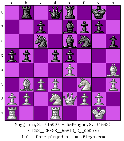 Last move : 1-0 2009 May 17 6:10:26 [Event "FICGS__CHESS__RAPID_C__000070"] [Site "FICGS"] [Date "2009.02.28"] [Round "1"] [White "Maggiolo,Stefano"] [Black "Gaffagan,Steven"] [Result "1-0"] [WhiteElo "1500"] [BlackElo "1693"] 1.e4 e5 2.Nf3 Nc6 3.Bb5 a6 4.Ba4 Nf6 5.O-O Be7 6.Qe2 b5 7.Bb3 O-O 8.c3 d5 9.d3 Re8 10.Bg5 Be6 11.Nbd2 Rb8 12.Rfd1 a5 13.h3 h6 14.Bh4 1-0 This chess game has been lost on time (started : 2009.02.28 12:19:41) Ruy Lopez : Worrall attack, sharp line Kingside Castling by player White (move 5) Kingside Castling by player Black (move 7) Player White won this chess game. Follow this game move after move (download)Chess is in its essence a game, in its form an art, and in its execution a science. (Baron Tassilo) Ein Schachspiel besteht aus drei Phasen: Die erste, wenn du hofftst den Vorteil zu haben, die zweite, wenn du glaubst einen Vorteil zu haben, und die dritte.... wenn du weißt Du wirst verlieren. (Savielly Grigorievitsch Tartakower) a manera como él juega al Ajedrez, demuestra la completa naturaleza de un hombre. (Stanley Ellin) Les échecs sont plus proches de l'art de l'assassinat que de l'art de la guerre. (Arturo Perez-Reverte) Happy endings are just stories that haven't finished yet. (Jane Smith in Mr & Mrs Smith)