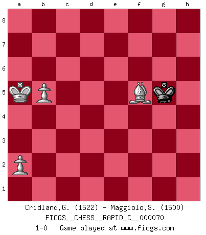 Last move : 1-0 2009 May 28 10:9:31 [Event "FICGS__CHESS__RAPID_C__000070"] [Site "FICGS"] [Date "2009.02.28"] [Round "1"] [White "Cridland,Graham"] [Black "Maggiolo,Stefano"] [Result "1-0"] [WhiteElo "1522"] [BlackElo "1500"] 1.e4 c5 2.Nf3 d6 3.d4 cxd4 4.Nxd4 Nf6 5.Nc3 a6 6.Bg5 Nc6 7.f4 e6 8.Nxc6 bxc6 9.e5 h6 10.Bxf6 gxf6 11.Qf3 fxe5 12.fxe5 d5 13.O-O-O Qg5+ 14.Kb1 Bg7 15.Bd3 Bxe5 16.Rhe1 Bxh2 17.Na4 Ke7 18.c4 Be5 19.g4 Rd8 20.Bf5 Qg7 21.Qe3 Bc7 22.Qc5+ Bd6 23.Qe3 Bd7 24.Nb6 Rab8 25.cxd5 cxd5 26.Rxd5 Bc7 27.Qc5+ Ke8 28.Qxc7 Qf6 29.Rxd7 Rxb6 30.Qxb6 Rxd7 31.Bxe6 Kf8 32.Qc5+ Re7 33.Bf5 Qh4 34.Qxe7+ Qxe7 35.Rxe7 Kxe7 36.Bd3 a5 37.Kc2 Kf6 38.Kb3 Kg5 39.Be2 Kf4 40.Ka4 Ke3 41.Ba6 Kf4 42.Bc8 h5 43.gxh5 Kg5 44.Kxa5 Kxh5 45.b4 Kg5 46.b5 f5 47.Bxf5 1-0 Sicilian : Najdorf, 6.Bg5 Queenside Castling by player White (move 13) 10 pieces endgame at move 35 : White KRBPPP , Black KPPP WHITE : King + 1 Rook 1 Bishop 3 Pawns BLACK : King + 3 Pawns 9 pieces endgame at move 35 : White KBPPP , Black KPPP WHITE : King + 1 Bishop 3 Pawns BLACK : King + 3 Pawns 8 pieces endgame at move 43 : White KBPPP , Black KPP WHITE : King + 1 Bishop 3 Pawns BLACK : King + 2 Pawns 7 pieces endgame at move 44 : White KBPPP , Black KP WHITE : King + 1 Bishop 3 Pawns BLACK : King + 1 Pawn 6 pieces endgame at move 44 : White KBPP , Black KP WHITE : King + 1 Bishop 2 Pawns BLACK : King + 1 Pawn 5 pieces endgame at move 47 : White KBPP , Black K WHITE : King + 1 Bishop 2 Pawns BLACK : King + Player White won this chess game. Follow this game move after move (download)I thought the most common mistake [in chess] was the first one: Learning the game :P (Garvin Gray, FICGS forum) Es tut gut, die Entwicklungsperiode von, [...] demokratischem Geist durchdringen zu lassen. Wie undemokratisch wäre es doch beispielsweise, den einen Offizier große Spaziertouren vornehmen zu lassen, während die anderen zu Hause säßen und sich entsetzlich langweilten. (Aaron Nimzowitsch) La vida es como el Ajedrez, con lucha, competición y eventos buenos y malos. (Benjamin Franklin) On entre au jeu d'Echecs comme on entre en Religion. Pour le joueur d'Echecs, la partie d'Echecs c'est l'office, la messe, le défilé du 1er Mai, le dépôt de gerbe au Monument aux Morts. C'est un drame sacré. (Michel Roos) To err is human, to shift the blame on someone else is tactical. (Mladen Jankovic)