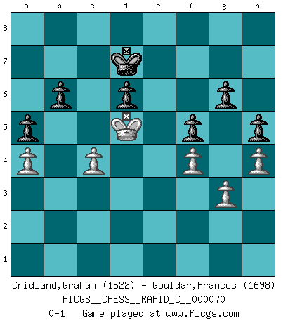 Last move : 0-1 2009 April 2 17:44:53 [Event "FICGS__CHESS__RAPID_C__000070"] [Site "FICGS"] [Date "2009.02.28"] [Round "1"] [White "Cridland,Graham"] [Black "Gouldar,Frances"] [Result "0-1"] [WhiteElo "1522"] [BlackElo "1698"] 1.e4 e5 2.Nf3 Nc6 3.Bb5 d6 4.c3 Bd7 5.O-O Nf6 6.Re1 Be7 7.d4 exd4 8.cxd4 O-O 9.e5 Nd5 10.Nc3 Nxc3 11.bxc3 Nxe5 12.Rb1 Nxf3+ 13.Qxf3 Bxb5 14.Rxb5 b6 15.d5 Bf6 16.c4 a6 17.Rb3 Re8 18.Be3 Bd4 19.Kf1 Bxe3 20.Rbxe3 Rxe3 21.Qxe3 g6 22.Qe7 Qxe7 23.Rxe7 Rc8 24.Ke2 Kf8 25.Re3 Re8 26.Kd3 Rxe3+ 27.Kxe3 Ke7 28.Kd4 Kd7 29.a4 f5 30.f4 c6 31.g3 cxd5 32.Kxd5 h6 33.h3 h5 34.h4 a5 0-1 Ruy Lopez : Old Steinitz defense Kingside Castling by player White (move 5) Kingside Castling by player Black (move 8) Player Black won this chess game. Follow this game move after move (download)Only sissies Castle. (Rob Sillars) Ich könnte leicht behaupten: Ja,ja, Leonid Breschnew wollte nicht, daß ich Weltmeister werde. In der Tat war die Sache komplizierter. (Viktor Kortschnoi) La pasion por jugar al Ajedrez es una de las mas inexplicables en el mundo. (H.G. Wells) Des combinaisons [dans le jeu d'échecs] pareilles à des mélodies. Je crois entendre pour ainsi dire la musique des coups... (Vladimir Nabokov) True nature is revealed in times of difficulty. (Chinese proverb)