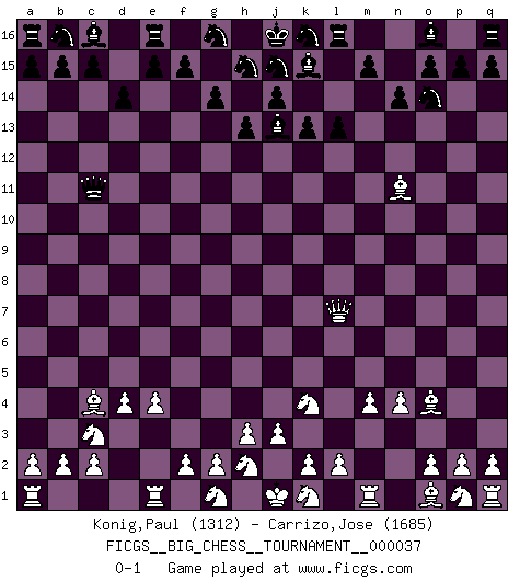 Last move : 0-1 2009 March 12 20:54:47 [Event "FICGS__BIG_CHESS__TOURNAMENT__000037"] [Site "FICGS"] [Date "2009.02.28"] [Round "1"] [White "Konig,Paul"] [Black "Carrizo,Jose"] [Result "0-1"] [WhiteElo "1312"] [BlackElo "1685"] 1.j2-k4 p16-o14 2.h1-o7 h14-h13 3.e2-e4 g15-g14 4.f1-c4 n15-n14 5.m2-m4 k15-k13 6.l1-o4 f16-j13 7.o7-l7 d15-d14 8.d2-d4 l16-k15 9.b1-c3 l15-l13 10.c1-n11 m16-l16 11.n2-n4 h16-c11 0-1 Follow this game move after move (download)Chess is a part of culture and if a culture is declining then Chess too will decline. (Mikhail Botvinnik) Das Schachspiel hat wie die Liebe, die Musik, die Fähigkeit, den Menschen glücklich zu machen. Ich habe ein leises Gefühl des Bedauerns für jeden, der das Schachspiel nicht kennt, so wie ich jeden bedaure, der die Liebe nicht kennt. (Siegbert Tarrasch) El pensamiento metódico es mas útil en el Ajedrez que la inspiración. (C. J. S. Purdy) Avec des compensations pour le matériel en plus... (Anonyme) A belief is an idea the mind possesses, an idea that possesses the mind. (Robert Oxden Bolton)