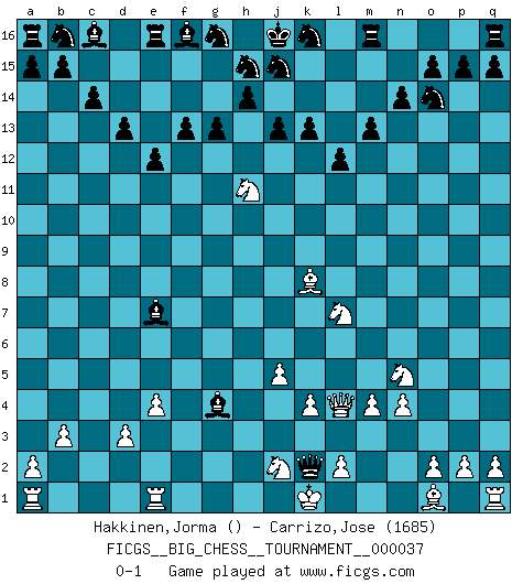 Last move : 0-1 2009 March 27 9:58:0 [Event "FICGS__BIG_CHESS__TOURNAMENT__000037"] [Site "FICGS"] [Date "2009.02.28"] [Round "1"] [White "Hakkinen,Jorma"] [Black "Carrizo,Jose"] [Result "0-1"] [WhiteElo ""] [BlackElo "1685"] 1.k2-k4 g15-g13 2.j2-h4 p16-o14 3.j3-j4 n15-n14 4.j4-j5 d15-d13 5.h1-l4 l15-l13 6.d2-d3 k15-k13 7.c1-k8 c15-c14 8.e2-e4 e15-e13 9.m2-m3 m15-m13 10.f1-e2 f15-f13 11.l1-j3 e13-e12 12.g1-f3 h16-a9 13.k1-l3 a9-b9 14.b2-b3 b9-c8 15.h4-j6 c8-c2 16.f3-g5 c2-b2 17.b1-d2 b2-d2 18.g5-h7 d2-a5 19.p1-o3 a5-a7 20.j6-l7 a7-f2 21.m3-m4 f2-g2 22.m1-m3 g2-h3 23.h2-j4 h3-j3 24.j1-k1 j14-j13 25.h7-g9 l16-c8 26.e2-g4 c8-g4 27.l3-j2 j3-j4 28.m3-j3 j4-j3 29.o3-n5 l13-l12 30.g9-h11 o16-e7 31.n2-n4 j3-k2 0-1 Follow this game move after move (download)Chess holds its master in its own bonds, shackling the mind and brain so that the inner freedom of the very strongest must suffer. (Albert Einstein) Kleine Schachspieler machen Mist, und große Schachspieler machen Mist, aber große machen weniger Mist. (Fritz Sämisch) Nada excita más a Grandes Maestros aburridos que una novedad teórica. (Dominic Lawson) Le jeu d'échecs est comme rejeté hors du temps. (Antoine de Saint-Exupéry) Strategy without tactics is the slowest route to victory. Tactics without strategy is the noise before defeat. (Sun Tzu)