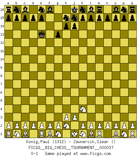 Last move : 0-1 2009 March 7 18:28:7 [Event "FICGS__BIG_CHESS__TOURNAMENT__000037"] [Site "FICGS"] [Date "2009.02.28"] [Round "1"] [White "Konig,Paul"] [Black "Zaunercik,Ilmar"] [Result "0-1"] [WhiteElo "1312"] [BlackElo ""] 1.j2-k4 g15-g13 2.h1-o7 h16-e13 3.o7-f15 g16-f14 4.f15-e16 f14-e16 0-1 Follow this game move after move (download)In Chess, as it is played by masters, chance is practically eliminated. (Emanuel Lasker) Die Elozahlen sind sehr schlecht für das Schach. Jetzt ist Schach eine Sportindustrie, die darauf zielt Elopunkte zu machen. (Miguel Najdorf) Yo siempre he tenido un ligero sentimiento de lástima por una persona que no tiene conocimiento del Ajedrez. (Siegbert Tarrasch) Même un GMI sait rarement calculer sur plus de cinq coups une attaque à sacrifices. (Rudolf Spielmann) Luck has a peculiar habit of favoring those who don't depend on it. (Author unknown)