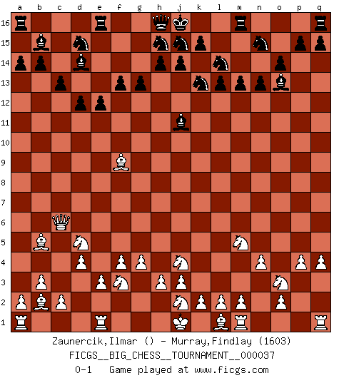 Last move : 0-1 2009 May 25 6:34:42 [Event "FICGS__BIG_CHESS__TOURNAMENT__000037"] [Site "FICGS"] [Date "2009.02.28"] [Round "1"] [White "Zaunercik,Ilmar"] [Black "Murray,Findlay"] [Result "0-1"] [WhiteElo ""] [BlackElo "1603"] 1.p2-p4 j15-k13 2.g2-g4 f15-f13 3.f2-f4 e15-e13 4.h1-c6 c15-c13 5.p1-o3 o15-o14 6.k1-l3 b15-b14 7.b1-c3 c16-b15 8.b2-b3 n15-n13 9.n2-n3 g16-j15 10.o1-b13 a15-a14 11.b13-f9 o16-j11 12.n3-n4 d15-d13 13.c1-b2 d13-d12 14.g1-f3 p16-n15 15.e2-e3 m15-m13 16.c3-d5 l16-o13 17.d2-d3 l15-l13 18.l3-m5 b16-d15 19.q2-q4 e13-e12 20.d3-d4 f16-d14 21.f1-b5 k16-l14 22.h2-j4 g15-g13 0-1 This big chess game has been lost on time (started : 2009.02.28 21:39:28) Follow this game move after move (download)Of all my Russian books, the defense contains and diffuses the greatest 'warmth' which may seem odd seeing how supremely abstract Chess is supposed to be. (Vladimir Nabokov) Die Auseinandersetzung mit Karpow war politisch geprägt. Er stand für das kommunistische System, wurde von dessen Repräsentanten gehätschelt. Ich war der Oppositionelle. Jeder Schachweltmeister spiegelt auch die gesellschaftlichen Verhältnisse wider. Kramnik steht für die Börsen-Generation des Neuen Markts, ideologiefrei, zahlenfixiert. (Garry Kasparov) La vida es como un juego de Ajedrez, cambiando con cada movimiento. (Proverbio Chino) Soyez une menace à chaque fois que vous vous asseyez pour jouer. (Ken Smith) Life is painting a picture, not doing a sum. (Oliver Wendell Holmes, Jr.)