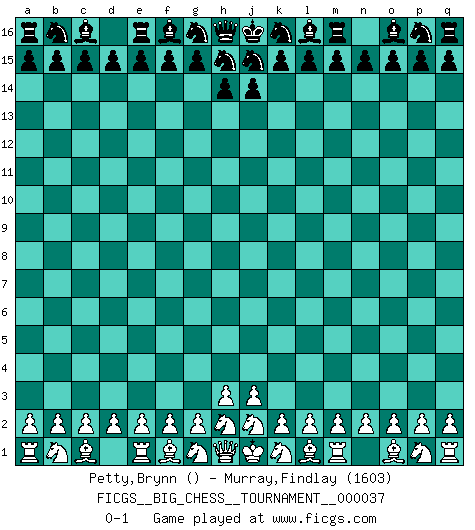 Last move : 0-1 2009 March 1 2:19:31 [Event "FICGS__BIG_CHESS__TOURNAMENT__000037"] [Site "FICGS"] [Date "2009.02.28"] [Round "1"] [White "Petty,Brynn"] [Black "Murray,Findlay"] [Result "0-1"] [WhiteElo ""] [BlackElo "1603"] 0-1 Follow this game move after move (download)The passed pawn is a criminal, who should be kept under lock and key. Mild measures, such as police surveillance, are not sufficient. (Nimzovitch) Offensichtlich kennt Kasparow nichts anderes als Schach, und ich könnte 500 weitere Spieler dieser Sorte benennen. (Judith Polgar) En el tablero, la mentira e hipocresía no sobreviven mucho. (Emanuel Lasker) Fischer est le meilleur joueur du monde et Karpov n'est qu'un joueur de bistrot. (Garry Kasparov, agé de 16 ans) In my experience, there's no such thing as luck. (Obi-Wan Kenobi in Star Wars ep.4)