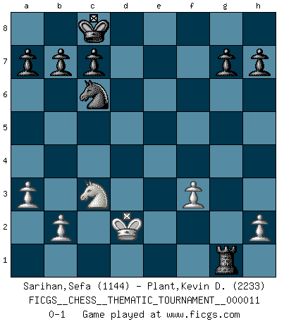 Last move : 0-1 2006 November 14 11:12:4 [Event "FICGS__CHESS__THEMATIC_TOURNAMENT__000011"] [Site "FICGS"] [Date "2006.09.04"] [Round "1"] [White "Sarihan,Sefa"] [Black "Plant,Kevin D."] [Result "0-1"] [WhiteElo "1144"] [BlackElo "2233"] 1.e4 e5 2.Nf3 f5 3.exf5 d6 4.d4 Bxf5 5.dxe5 Nc6 6.exd6 Qxd6 7.Bc4 Qxd1+ 8.Kxd1 O-O-O 9.Bd2 Nf6 10.Kc1 Bc5 11.Rf1 Ne4 12.Be3 Rhe8 13.Nc3 Bxe3+ 14.fxe3 Nd6 15.Bd3 Bxd3 16.cxd3 Rxe3 17.Kd2 Nc4+ 18.Kc2 Rexd3 19.Rae1 Ne3+ 20.Rxe3 Rxe3 21.a3 Rf8 22.Kd2 Re6 23.Rc1 Rg6 24.Rg1 Rxf3 25.gxf3 Rxg1 0-1 Latvian counter-gambit Queenside Castling by player Black (move 8) Player Black won this chess game. Follow this game move after move (download)After a bad opening, there is hope for the middle game. After a bad middle game, there is hope for the endgame. But once you are in the endgame, the moment of truth has arrived. (Edmar Mednis) Schon mancher Spieler hat aufgegeben, um zu vermeiden, daß er eine Figur verliert. (Savielly Grigorievitsch Tartakower) En el Ajedrez, tal como en la vida, las bendiciones de hoy pueden ser el veneno del mañana. (Assaic) Les erreurs sont comme les malheurs, elles n'arrivent jamais seules. (Siegbert Tarrasch) Computer Science is no more about computers than astronomy is about telescopes. (Edsger W. Dijkstra)