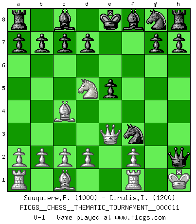 Last move : 0-1 2006 November 13 21:53:14 [Event "FICGS__CHESS__THEMATIC_TOURNAMENT__000011"] [Site "FICGS"] [Date "2006.09.04"] [Round "1"] [White "Souquiere,Florence"] [Black "Cirulis,Ilmars"] [Result "0-1"] [WhiteElo "1000"] [BlackElo "1200"] 1.e4 e5 2.Nf3 f5 3.Bc4 fxe4 4.Nc3 exf3 5.gxf3 Nc6 6.O-O Qg5+ 7.Kh1 Nd4 8.Qe1 Qh5 9.Qe3 Nxf3 10.Nd5 Qxh2+ 0-1 Latvian gambit, 3.Bc4 Kingside Castling by player White (move 6) Player Black won this chess game. Follow this game move after move (download)First-class players lose to second class players because second-class players sometimes play a first-class game. (Tarrasch) Die FIDE ist dabei in die Hände der russischen Mafia zu fallen. (Larry Evans) No es tiempo de jugar al Ajedrez cuando la casa esta en llamas. (Proverbio Italiano) Les ravages du H expliquent la différence de niveau entre Tal et Thal [Abergel]. Don't be discouraged. It's often the last key in the bunch that opens the lock. (Author unknown)