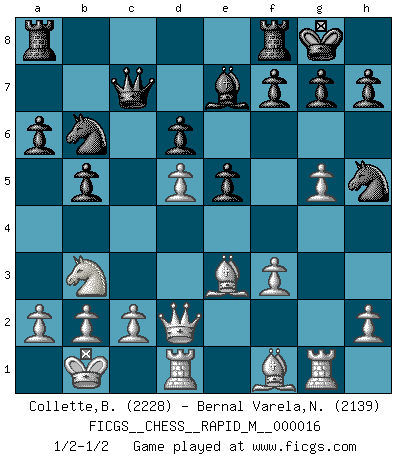 Last move : 1/2-1/2 2009 April 3 2:40:8 [Event "FICGS__CHESS__RAPID_M__000016"] [Site "FICGS"] [Date "2009.03.02"] [Round "1"] [White "Collette,Benjamin"] [Black "Bernal Varela,Nelson"] [Result "1/2-1/2"] [WhiteElo "2228"] [BlackElo "2139"] 1.e4 c5 2.Nf3 d6 3.d4 cxd4 4.Nxd4 Nf6 5.Nc3 a6 6.Be3 Ng4 7.Bc1 Nf6 8.f3 e5 9.Nb3 Be7 10.Be3 Be6 11.Qd2 Nbd7 12.g4 O-O 13.O-O-O b5 14.g5 Nh5 15.Nd5 Bxd5 16.exd5 Qc7 17.Kb1 Nb6 18.Rg1 1/2-1/2 Sicilian : Najdorf, Byrne (English) attack Kingside Castling by player Black (move 12) Queenside Castling by player White (move 13) This chess game ended in a draw. Follow this game move after move (download)The enormous mental resilience, without which no Chess player can exist, was so much taken up by Chess that he could never free his mind of this game. (Albert Einstein) Bis zum Jahr 1971 verlief in meiner Schachkariere alles glatt. Dieses dramatische Match [Fischer-Taimanov 6:0] machte mein Leben zur Hölle. (Mark Taimanov) El juego del Ajedrez no es solamente una diversión quieta; algunas cualidades muy valuables de la mente se pueden adquirir y cultivar con el, como convertirlos en habitos disponibles para toda ocasión; ya que la vida es algo así como el Ajedrez. (Benjamin Franklin) Le thème de l'attaque double intervient d'une manière ou d'une autre dans l'immense majorité des combinaisons. (Youri Averbakh) It's not the will to win, but the will to prepare to win that makes the difference. (Bear Bryant)