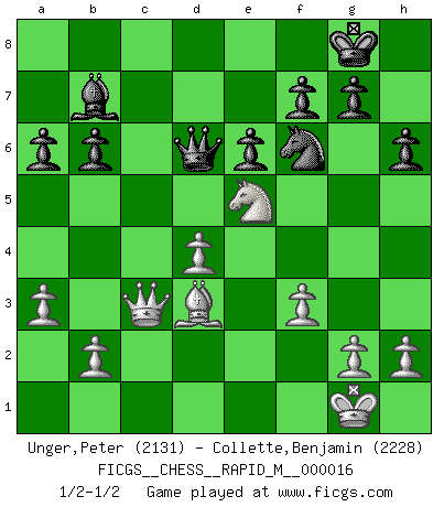 Last move : 1/2-1/2 2009 March 28 18:4:16 [Event "FICGS__CHESS__RAPID_M__000016"] [Site "FICGS"] [Date "2009.03.02"] [Round "1"] [White "Unger,Peter"] [Black "Collette,Benjamin"] [Result "1/2-1/2"] [WhiteElo "2131"] [BlackElo "2228"] 1.d4 Nf6 2.Nf3 e6 3.c4 d5 4.Nc3 Be7 5.Bg5 h6 6.Bh4 O-O 7.e3 b6 8.Be2 Bb7 9.Rc1 dxc4 10.Bxc4 Nbd7 11.O-O c5 12.dxc5 Nxc5 13.Qe2 a6 14.Rfd1 Qe8 15.a3 Nfe4 16.Nxe4 Nxe4 17.Bxe7 Qxe7 18.Ne5 Rfd8 19.f3 Nc5 20.Rd4 Rac8 21.Qd2 Rxd4 22.exd4 Nd7 23.Bd3 Rxc1+ 24.Qxc1 Qd6 25.Qc3 Nf6 1/2-1/2 Queen's pawn game Kingside Castling by player Black (move 6) Kingside Castling by player White (move 11) This chess game ended in a draw. Follow this game move after move (download)A player surprised is half beaten. (Proverb) Im Schach gibt es keinen Platz für Galanterie. (Irving Chernev) Una buena ofensiva y una buena defensa, comienzan ambas con un buen desarrollo. (Bruce A. Moon) La menace est plus forte que l'exécution. (Aaron Nimzovitch) Creativity involves breaking out of established patterns in order to look at things in a different way. (Edward De Bono)