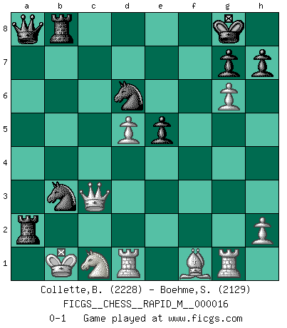 Last move : 0-1 2009 April 11 1:48:44 [Event "FICGS__CHESS__RAPID_M__000016"] [Site "FICGS"] [Date "2009.03.02"] [Round "1"] [White "Collette,Benjamin"] [Black "Boehme,Sebastian"] [Result "0-1"] [WhiteElo "2228"] [BlackElo "2129"] 1.e4 c5 2.Nf3 d6 3.d4 cxd4 4.Nxd4 Nf6 5.Nc3 a6 6.Be3 e5 7.Nb3 Be6 8.f3 Be7 9.Qd2 O-O 10.O-O-O Nbd7 11.g4 b5 12.g5 b4 13.Ne2 Ne8 14.f4 a5 15.f5 Bxb3 16.cxb3 a4 17.bxa4 Rxa4 18.b3 Ra5 19.Kb1 d5 20.exd5 Bc5 21.Bxc5 Nxc5 22.Qxb4 Nd6 23.g6 Qa8 24.Nc1 fxg6 25.fxg6 Rb8 26.Qc3 Rxa2 27.Rg1 Nxb3 0-1 Sicilian : Najdorf, Byrne (English) attack Kingside Castling by player Black (move 9) Queenside Castling by player White (move 10) Player Black won this chess game. Follow this game move after move (download)Adequate compensation for a sacrifice is having a sound combination leading to a winning position; adequate compensation for a blunder is having your opponent snatch defeat from the jaws of victory. (Bruce A. Moon) Es macht mich traurig, wenn ich sehe, dass Golfprofis mehr verdienen als Schachsportler. Obwohl ich davon überzeugt bin, dass wir Schachspieler viel härter trainieren müssen als die Golfer. (Alexandra Kosteniuk) Un mal día en el Ajedrez, es mejor que cualquier buen día en el trabajo. (Anonymous) A ce moment-là, je menaçais de comprendre la position ! (Clément L'Heureux) I fear not the man who has practiced 10,000 kicks once, but I fear the man who has practiced one kick 10,000 times. (Bruce Lee)