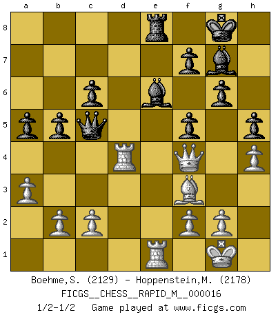 Last move : 1/2-1/2 2009 April 15 0:49:26 [Event "FICGS__CHESS__RAPID_M__000016"] [Site "FICGS"] [Date "2009.03.02"] [Round "1"] [White "Boehme,Sebastian"] [Black "Hoppenstein,Michael"] [Result "1/2-1/2"] [WhiteElo "2129"] [BlackElo "2178"] 1.e4 c6 2.d4 d5 3.Nc3 dxe4 4.Nxe4 Nd7 5.Nf3 Ngf6 6.Nc3 g6 7.Bd3 Bg7 8.O-O Nf8 9.h3 Ne6 10.Be3 O-O 11.Re1 b5 12.Qd2 Bb7 13.Rad1 a6 14.Ng5 Nxg5 15.Bxg5 Re8 16.Be2 Qb6 17.Bf3 Rad8 18.a3 Bc8 19.Bf4 a5 20.Be5 Be6 21.h4 h5 22.Qf4 Rd7 23.Bxf6 exf6 24.Ne4 f5 25.Nc5 Rxd4 26.Rxd4 Qxc5 1/2-1/2 Caro-Kann : Steinitz variation Kingside Castling by player White (move 8) Kingside Castling by player Black (move 10) This chess game ended in a draw. Follow this game move after move (download)Chess is played with the mind and not with the hands ! (Renaud and Kahn) Ich verstehe Aljechins Kombinationen ganz gut; aber woher er diese Angriffschancen bekommt und wie er die Eröffnung behandelt das ist für mich ein Buch mit sieben Siegeln. (Rudolf Spielmann) El jugador blanco perdió porque fallo en recordar la coreccta continuación y tuvo que pensar por sí mismo las movidas. (Siegbert Tarrasch) Il n'y a pas eu de défaite parce que je ne crois pas que cet ordinateur ait jamais existé. IBM a triché en refusant d'imprimer les modes de recherche de la machine. C'est évident, pendant le match, des coups décisifs ont été joués par des êtres humains. Aujourd'hui, les meilleurs spécialistes en informatique ne peuvent toujours pas expliquer comment Deep-Blue a pu jouer contre la logique des ordinateurs. IBM a gagné une guerre de communication, mais ils sont incapables de prouver que l'ordinateur a gagné tout seul. (Garry Kasparov) The smarter you play, the luckier you'll be. (Mark Pilarski)