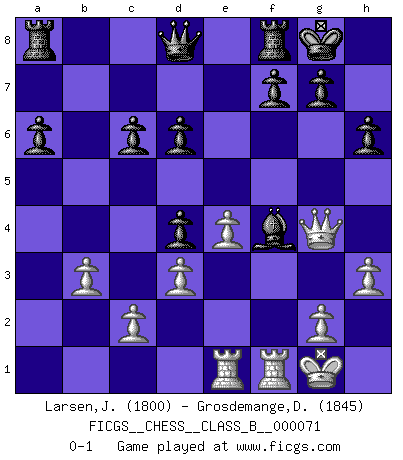 Last move : 0-1 2009 July 6 9:59:47 [Event "FICGS__CHESS__CLASS_B__000071"] [Site "FICGS"] [Date "2009.03.02"] [Round "1"] [White "Larsen,Jarl Eirik"] [Black "Grosdemange,David"] [Result "0-1"] [WhiteElo "1800"] [BlackElo "1845"] 1.e4 c5 2.Nf3 Nc6 3.Nc3 e5 4.Bc4 Be7 5.O-O Nf6 6.d3 d6 7.a4 O-O 8.h3 h6 9.Bd2 a6 10.Qe2 Bd7 11.Rae1 Nd4 12.Nxd4 cxd4 13.Nd5 Nxd5 14.Bxd5 Bxa4 15.b3 Bc6 16.Bxc6 bxc6 17.f4 exf4 18.Bxf4 Bg5 19.Qg4 Bxf4 0-1 Sicilian defense Kingside Castling by player White (move 5) Kingside Castling by player Black (move 7) Player Black won this chess game. Follow this game move after move (download)Chess demands total concentration. (Bobby Fischer) Schach ist eine Sache der genauen Beurteilung, wann man zuschlagen und wann man sich ducken muss. (Robert James Fischer) El Ajedrez lo es todo: arte, ciencia y deporte. (Anatoly Karpov) Les échecs, c'est l'art d'analyser. (Mikhail Botvinnik) Life is like a ten-speed bicycle: most of us have gears we never use. (Charles M. Schulz)