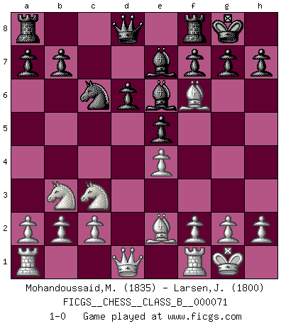 Last move : 1-0 2009 May 22 18:27:2 [Event "FICGS__CHESS__CLASS_B__000071"] [Site "FICGS"] [Date "2009.03.02"] [Round "1"] [White "Mohandoussaid,Malik"] [Black "Larsen,Jarl Eirik"] [Result "1-0"] [WhiteElo "1835"] [BlackElo "1800"] 1.e4 c5 2.Nf3 d6 3.d4 cxd4 4.Nxd4 e5 5.Nb3 Be6 6.Nc3 Nf6 7.Be2 Be7 8.O-O O-O 9.Bg5 Nc6 10.Bxf6 1-0 This chess game has been lost on time (started : 2009.03.02 17:0:39) Sicilian Kingside Castling by player White (move 8) Kingside Castling by player Black (move 8) Player White won this chess game. Follow this game move after move (download)The sign of a great Master is his ability to win a won game quickly and painlessly. (Irving Chernev) Ein Schachgenie ist jemand der verdammt gut Schach spielt. (Jonathan Levitt) Ayuda a tus piezas para que ellas te puedan ayudar. (Paul Morphy) Les échecs sont un jeu par leur forme, un art par leur essence et une science par sa difficulté d'acquisition. Ils peuvent vous procurer autant de plaisir qu'un bon livre ou une belle musique, mais vous n'aurez une réelle joie que si vous arrivez à bien jouer. (Tigran Petrosian) A married woman is like a fish riding a bicycle. (Rodolfo d'Ettorre)