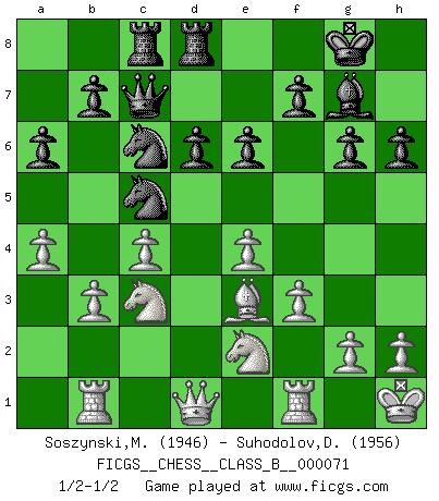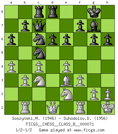 Last move : 1/2-1/2 2009 June 8 17:42:5 [Event "FICGS__CHESS__CLASS_B__000071"] [Site "FICGS"] [Date "2009.03.02"] [Round "1"] [White "Soszynski,Marek"] [Black "Suhodolov,Dmitry"] [Result "1/2-1/2"] [WhiteElo "1946"] [BlackElo "1956"] 1.e4 c5 2.Nf3 d6 3.Bb5+ Bd7 4.Bxd7+ Qxd7 5.c4 Nc6 6.Nc3 g6 7.d4 cxd4 8.Nxd4 Bg7 9.Nde2 Nf6 10.f3 O-O 11.O-O a6 12.a4 e6 13.Bg5 Qc7 14.Kh1 Nd7 15.b3 Nc5 16.Rb1 Rac8 17.Bf4 Qa5 18.Na2 Ne5 19.Bg5 h6 20.Bd2 Qc7 21.Nac3 Rfd8 22.Be3 Nc6 1/2-1/2 Sicilian : Canal-Sokolsky attack, Sokolsky variation Kingside Castling by player Black (move 10) Kingside Castling by player White (move 11) This chess game ended in a draw. Follow this game move after move (download)Pawns: they are the soul of this game, they alone form the attack and defense. (Philidor) Ein Kibitz ist einer, der deinem Gegner gute Ratschläge gibt. (Andrew Soltis) Una buena ofensiva y una buena defensa, comienzan ambas con un buen desarrollo. (Bruce A. Moon) Les Echecs, c'est l'art de la guerre sans les charniers, c'est la résurrection des morts tombés au champ d'honneur, l'espoir perpétuel, la suprématie de l'intelligence sur la force, la culture de l'esprit. (F. Szpiner) Lamb in skin of tiger, still fears the wolf. (Chinese proverb)