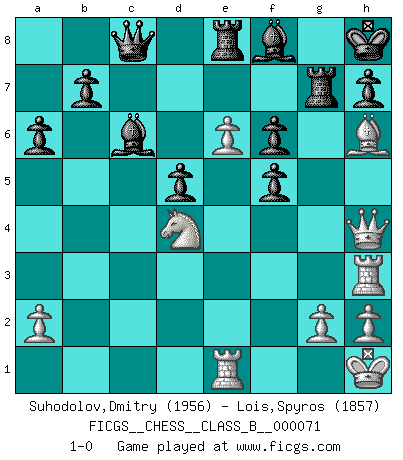 Last move : 1-0 2009 July 3 14:15:6 [Event "FICGS__CHESS__CLASS_B__000071"] [Site "FICGS"] [Date "2009.03.02"] [Round "1"] [White "Suhodolov,Dmitry"] [Black "Lois,Spyros"] [Result "1-0"] [WhiteElo "1956"] [BlackElo "1857"] 1.d4 Nf6 2.c4 g6 3.Nc3 d5 4.cxd5 Nxd5 5.e4 Nxc3 6.bxc3 Bg7 7.Bc4 c5 8.Ne2 Nc6 9.Be3 O-O 10.O-O Bd7 11.Rb1 Rc8 12.Bd3 Qc7 13.f4 cxd4 14.cxd4 e6 15.Qd2 Ne7 16.Rfc1 Bc6 17.d5 exd5 18.e5 f6 19.e6 Qd6 20.f5 Nxf5 21.Bxf5 gxf5 22.Nd4 Rfe8 23.Bf4 Qe7 24.Rc3 Kh8 25.Qe1 Bf8 26.Qh4 Qd8 27.Rh3 Rc7 28.Rc1 a6 29.Kh1 Qc8 30.Re1 Rg7 31.Bh6 1-0 King's Indian defense, 3.Nc3 Kingside Castling by player Black (move 9) Kingside Castling by player White (move 10) Player White won this chess game. Follow this game move after move (download)Not all artists are Chess players, but all Chess players are artists. (Marcel Duchamp) Ich rechne überhaupt nicht voraus. Ich gewinne auch so. (Robert James Fischer) Los tropiezos estan todos ahí en el tablero, esperando que se cometan. (Savielly Tartakover) J'ai vu le vaincu d'Echecs jouer des années durant dans l'espoir de la fête de la victoire. Car tu es plus riche de ce qu'elle existe si même elle n'est point pour toi. Ainsi de la perle du fond des mers. (Antoine de Saint-Exupéry) The mind is like a parachute, it only functions when its open. (Unknown)