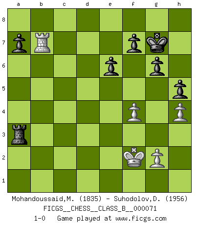 Last move : 1-0 2009 October 31 20:3:3 [Event "FICGS__CHESS__CLASS_B__000071"] [Site "FICGS"] [Date "2009.03.02"] [Round "1"] [White "Mohandoussaid,Malik"] [Black "Suhodolov,Dmitry"] [Result "1-0"] [WhiteElo "1835"] [BlackElo "1956"] 1.d4 Nf6 2.c4 g6 3.Nc3 d5 4.cxd5 Nxd5 5.e4 Nxc3 6.bxc3 Bg7 7.Nf3 c5 8.Be2 Nc6 9.Be3 Bg4 10.e5 cxd4 11.cxd4 O-O 12.O-O Qd7 13.h3 Be6 14.Qd2 Bd5 15.Rfd1 e6 16.Bh6 Bxh6 17.Qxh6 Bxf3 18.Bxf3 Nxd4 19.Qe3 Nxf3+ 20.Qxf3 Qc7 21.Rd6 Rad8 22.Rad1 Rxd6 23.Rxd6 Qa5 24.Qe2 Rc8 25.Rd7 Rc7 26.Rd6 Rc1+ 27.Kh2 Re1 28.Qd2 Qxe5+ 29.f4 Qe3 30.Rd8+ Kg7 31.Qxe3 Rxe3 32.Rd7 Ra3 33.Rxb7 Rxa2 34.Kg3 h5 35.h4 Ra3+ 36.Kf2 1-0 King's Indian defense, 3.Nc3 Kingside Castling by player Black (move 11) Kingside Castling by player White (move 12) Player White won this chess game. Follow this game move after move (download)Not only will I predict his triumph over Botvinnik, but I'll go further and say that he'll probably be the greatest Chess player that ever lived. (John Collins) Nicht daß Diemer aus Opportunismus Mitglied der NSDAP geworden wäre. Er war ein Fanatiker, in allem, was er tat. (Hans Ree) El Ajedrez es parte de una cultura y si una cultura esta en decadencia, entonces también el Ajedrez declinará. (Mikhail Botvinnik) Echiquier : carré parfait, comme la Jérusalem nouvelle décrite par l'auteur de l'Apocalypse, huit cases sur huit, exaltation du chiffre 4, symbole du cosmos aux quatre horizons... où le noir et le blanc, l'ombre et la lumière, le mal et le bien s'entremêlent et se conjuguent. (Robert Couffignal, Le Gambit du poète) All the biggest technological inventions created by man - the airplane, the automobile, the computer - says little about his intelligence, but speaks volumes about his laziness. (Mark Kennedy)