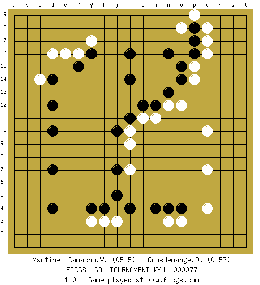 Last move : 1-0 2009 May 23 6:27:13 [Event "FICGS__GO__TOURNAMENT_KYU__000077 "] [Site "FICGS"] [Date "2009.03.03"] [Round "1"] [Black "Martinez Camacho,Victor Hugo "] [White "Grosdemange,David "] [Result "1-0"] [Rating 1 "0515"] [Rating 2 "0157"] 1.d4 q4 2.k4 q16 3.d10 d16 4.d14 f16 5.d7 q10 6.k16 k10 7.k14 c14 8.d12 q7 9.g16 g17 10.f15 e16 11.n16 q17 12.p16 p15 13.o15 p14 14.p17 q18 15.p18 p19 16.o14 o18 17.k11 l11 18.l12 m11 19.m12 n12 20.n13 o12 21.j10 k9 22.j7 k7 23.j5 g3 24.g4 j3 25.h4 h3 26.m4 n3 27.o4 o3 28.n4 1-0 This go game has been lost on time (started : 2009.03.03 5:39:37) Here are the names of the openings (joseki) played in the four corners : Corner d16 : d16 d14Hoshi (Hwajeom, Seongjeom, Xingwei`) 4-4 Point. The star or hoshi (4-4) point, emphasizing influence at the potential expense of territory.Ikken Takagakari (Hankan Nop'dakeolch'im, Yi Gaojia, 1-Space High Approach). White typically responds at 6-4 or 3-10. White 4-10 is played when White finds play on the right side advantageous. White 4-8 or 3-8 may be played when White has support at top. Corner q16 : q16 n16Hoshi (Hwajeom, Seongjeom, Xingwei`) 4-4 Point. The star or hoshi (4-4) point, emphasizing influence at the potential expense of territory.Nikken Takagakari (Dukan Nop'dakeolch'im, E`r Gaojia, 2-Space High Approach). Black 2 is a light approach move. Rarely played in even games, Black 2 is typically employed in handicap games. White continues with 6-4 or 3-10. In Korean Sunjang Baduk White has a stone on 8-4. Player Black won this Go (weiqi, baduk) game.Follow this game move after move (download ) Don't reduce your own liberties. (Bill Taylor) Don't anthropomorphize computers - they hate it. (Anonymous)