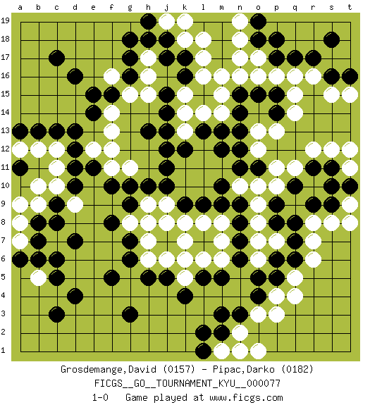 Last move : 1-0 2009 April 4 15:49:28 [Event "FICGS__GO__TOURNAMENT_KYU__000077"] [Site "FICGS"] [Date "2009.03.03"] [Round "1"] [Black "Grosdemange,David"] [White "Pipac,Darko"] [Result "1-0"] [Rating 1 "0157"] [Rating 2 "0182"] 1.d16 q4 2.d4 q16 3.r17 r16 4.q17 p16 5.p17 o17 6.o18 n17 7.s16 s15 8.t16 t15 9.s18 n18 10.o19 n19 11.p18 o16 12.q10 q11 13.r11 r12 14.s11 s12 15.r9 t11 16.t10 t12 17.s10 p11 18.d10 p10 19.p9 o9 20.p8 o8 21.l13 p7 22.q7 o7 23.n13 p13 24.k16 r7 25.q8 r8 26.q6 r6 27.p5 q5 28.p6 s8 29.s9 t8 30.o4 o6 31.n3 p4 32.o5 p3 33.n6 o3 34.m3 m6 35.m5 l6 36.l5 k6 37.n7 m7 38.n8 m8 39.n9 o10 40.m10 k5 41.k4 o12 42.h10 n10 43.m9 l8 44.j5 j6 45.h5 h6 46.g6 h7 47.g7 h8 48.g9 g8 49.f8 k7 50.k9 j8 51.f5 k8 52.c3 f13 53.d13 h9 54.f10 k10 55.j10 j9 56.l9 k11 57.j12 l12 58.m12 m11 59.n11 l11 60.n12 k13 61.k12 l14 62.m13 t9 63.j13 l10 64.j11 k14 65.j14 m14 66.n14 m15 67.n15 m16 68.c17 n2 69.m2 m1 70.l1 o1 71.l2 n1 72.f15 k15 73.j15 l16 74.k17 l17 75.d7 k18 76.j18 l18 77.j17 j19 78.h19 k19 79.h18 f14 80.e14 f12 81.e11 g15 82.g16 f16 83.e15 h16 84.g17 h15 85.h13 e12 86.d12 f11 87.o15 n16 88.p15 q15 89.p14 q14 90.g3 g11 91.g10 o13 92.o11 c11 93.d11 c12 94.c13 b12 95.b13 a12 96.a13 b10 97.c9 b9 98.b8 a9 99.a11 a8 100.b7 c7 101.c6 a7 102.b6 b5 103.a6 c10 104.c5 d9 105.c8 h17 106.g18 pass 107.pass 1-0 Here are the names of the openings (joseki) played in the four corners : Corner q16 : q16 r17 Hoshi (Hwajeom, Seongjeom, Xingwei`) 4-4 Point. The star or hoshi (4-4) point, emphasizing influence at the potential expense of territory. Corner q4 : q4 r9 Hoshi (Hwajeom, Seongjeom, Xingwei`) 4-4 Point. The star or hoshi (4-4) point, emphasizing influence at the potential expense of territory. Corner d16 : d16 f13 Hoshi (Hwajeom, Seongjeom, Xingwei`) 4-4 Point. The star or hoshi (4-4) point, emphasizing influence at the potential expense of territory. Player Black won this Go (weiqi, baduk) game. Follow this game move after move (download)Don't overlook the edge of the board. (Anonymous) Yoga is 99% practice and 1% knowledge. (Sri Krishna Pattabhi Jois)