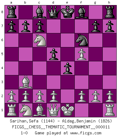 Last move : 1-0 2006 November 13 10:48:16 [Event "FICGS__CHESS__THEMATIC_TOURNAMENT__000011"] [Site "FICGS"] [Date "2006.09.04"] [Round "1"] [White "Sarihan,Sefa"] [Black "Aldag,Benjamin"] [Result "1-0"] [WhiteElo "1144"] [BlackElo "1826"] 1.e4 e5 2.Nf3 f5 3.exf5 e4 4.Nd4 Nf6 5.Bc4 d5 6.Bb3 Nc6 7.Nxc6 1-0 Latvian counter-gambit Player White won this chess game. Follow this game move after move (download)Becoming successful at Chess allows you to discover your own personality. That's what I want for the kids I teach. (Saudin Robovic) Die größte Kunst beim Schach besteht darin dem Gegner nicht zu zeigen was er tun kann. (Garry Kasparov) Nada excita más a Grandes Maestros aburridos que una novedad teórica. (Dominic Lawson) Il vaut toujours mieux jouer un plan faux de façon logique que de n'avoir pas de plan du tout. (Victor Kortchnoï) Humor is by far the most significant activity of the human brain. (Edward De Bono)