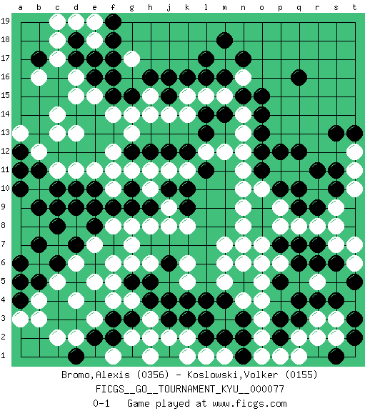 Last move : 0-1 2009 August 20 18:57:33 [Event "FICGS__GO__TOURNAMENT_KYU__000077"] [Site "FICGS"] [Date "2009.03.03"] [Round "1"] [Black "Bromo,Alexis"] [White "Koslowski,Volker"] [Result "0-1"] [Rating 1 "0356"] [Rating 2 "0155"] 1.q16 d4 2.q4 d16 3.k16 p11 4.k4 k8 5.d10 f10 6.q10 p9 7.p10 o10 8.q9 m15 9.m16 n16 10.l16 m17 11.l17 q8 12.o9 p8 13.o8 q11 14.o11 n10 15.n17 p6 16.r11 r8 17.p12 n11 18.q12 m3 19.m4 n4 20.n5 m5 21.l4 o5 22.n6 m6 23.o6 o7 24.n7 m7 25.p7 n8 26.n3 o4 27.q7 o7 28.q6 h2 29.l3 e9 30.d9 d8 31.c8 o3 32.m2 c7 33.c9 o2 34.d7 d6 35.e8 f8 36.c6 e7 37.b7 k14 38.m18 h3 39.p5 h14 40.n15 r3 41.q3 e5 42.e10 q2 43.o6 n7 44.f9 g8 45.g10 f11 46.g12 g11 47.g9 c13 48.e12 h11 49.j12 f12 50.f13 g13 51.h12 f14 52.e13 e11 53.j10 d11 54.d12 c11 55.c12 b12 56.e14 e15 57.f15 g14 58.g15 d13 59.d14 c14 60.e16 d15 61.f16 k2 62.j4 j11 63.d17 n13 64.o14 c17 65.d18 c5 66.b5 b4 67.a4 a3 68.a5 b3 69.m14 h10 70.h9 l15 71.l14 k15 72.j16 j9 73.k10 n14 74.o15 h8 75.e9 c18 76.c10 e18 77.e17 s9 78.r7 s7 79.s6 t12 80.s13 r5 81.r4 s3 82.s4 t6 83.t5 t7 84.r6 n6 85.h4 g4 86.g5 h6 87.h5 m1 88.l2 o1 89.t3 s2 90.t2 p6 91.s1 r2 92.p3 p1 93.o6 b6 94.a6 p6 95.p2 q1 96.r9 s8 97.s10 b10 98.b9 l1 99.n2 f5 100.f7 g6 101.e6 f6 102.d5 d19 103.f18 d6 104.t9 n9 105.o13 n12 106.o12 e7 107.a10 g7 108.b11 e19 109.f19 c19 110.a12 a13 111.a11 g17 112.f17 h15 113.h16 o6 114.j3 j2 115.n1 k1 116.g3 f4 117.f3 g2 118.f2 e3 119.e2 d2 120.d1 c2 121.g1 h1 122.k3 f1 123.l13 k11 124.k12 l12 125.l11 m12 126.k9 j8 127.j6 k6 128.j15 j14 129.t8 t10 130.s11 t11 131.t13 k5 132.b17 b16 0-1 Here are the names of the openings (joseki) played in the four corners : Corner q16 : q16 p11 Hoshi (Hwajeom, Seongjeom, Xingwei`) 4-4 Point. The star or hoshi (4-4) point, emphasizing influence at the potential expense of territory. Corner q4 : q4 p9 Hoshi (Hwajeom, Seongjeom, Xingwei`) 4-4 Point. The star or hoshi (4-4) point, emphasizing influence at the potential expense of territory. Player White won this Go (weiqi, baduk) game. Follow this game move after move (download)Don't defend - extend ! (Bill Taylor) Fear is the path to the dark side. Fear leads to anger; anger leads to hate; hate leads to suffering. I sense much fear in you. (Master Yoda in Star Wars ep.1)