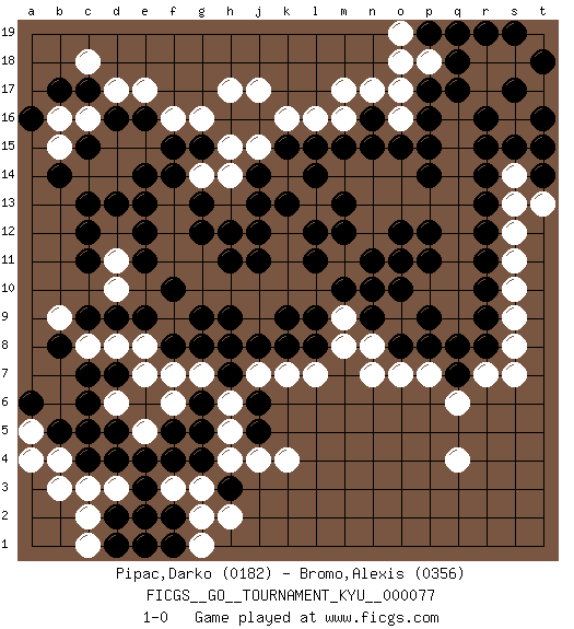 Last move : 1-0 2009 April 2 18:7:13 [Event "FICGS__GO__TOURNAMENT_KYU__000077"] [Site "FICGS"] [Date "2009.03.03"] [Round "1"] [Black "Pipac,Darko"] [White "Bromo,Alexis"] [Result "1-0"] [Rating 1 "0182"] [Rating 2 "0356"] 1.d4 q4 2.d16 q16 3.o15 k16 4.k15 k4 5.j5 q10 6.n10 d10 7.g12 k10 8.l9 n7 9.f8 n13 10.c11 d11 11.c12 j15 12.j14 k14 13.l15 l16 14.m15 m16 15.n15 o16 16.n16 n17 17.p15 q15 18.p16 o17 19.p17 p18 20.q17 r17 21.q18 r18 22.q19 o18 23.r19 m17 24.j16 h15 25.h16 g16 26.g15 h14 27.j13 g14 28.f15 h17 29.r16 s16 30.r15 q14 31.s15 t17 32.t15 s14 33.t14 s13 34.t16 s18 35.s17 t13 36.t18 o14 37.s19 m14 38.p14 p13 39.l14 n14 40.k13 f16 41.e16 e15 42.f14 f13 43.e14 d15 44.g13 j17 45.e13 f12 46.c15 d14 47.d13 e17 48.e12 f11 49.e11 c14 50.b14 c16 51.c13 d17 52.c17 b16 53.b17 b15 54.a16 c18 55.p19 o19 56.f10 g11 57.h11 g10 58.g9 h10 59.h9 j10 60.j11 k11 61.h12 j9 62.r14 q13 63.r13 s12 64.r12 s11 65.o12 o13 66.p12 n12 67.m12 q12 68.n11 o11 69.p11 q11 70.o10 p10 71.o11 o9 72.r11 s10 73.r10 s9 74.r9 s8 75.r8 s7 76.p9 q9 77.p8 q8 78.q7 r7 79.m13 q6 80.o8 p7 81.q8 o7 82.j8 l10 83.k9 h8 84.h7 n8 85.n9 m8 86.l8 l7 87.m10 m9 88.k8 k7 89.g8 j7 90.h8 h6 91.l11 k12 92.l12 g7 93.g6 f7 94.j6 h5 95.j12 e7 96.d9 e8 97.e9 d8 98.g5 h4 99.g4 j4 100.h3 f6 101.f5 e5 102.e4 g3 103.f4 f3 104.e3 h2 105.d5 d6 106.c7 c8 107.c6 e2 108.b8 c5 109.c4 d3 110.d2 c3 111.b5 b4 112.c5 b3 113.f2 g2 114.e1 c2 115.d1 c1 116.f1 g1 117.e2 a5 118.a6 a4 119.c9 b9 120.d7 1-0 Here are the names of the openings (joseki) played in the four corners : Corner q16 : q16 o15 Hoshi (Hwajeom, Seongjeom, Xingwei`) 4-4 Point. The star or hoshi (4-4) point, emphasizing influence at the potential expense of territory. Corner q4 : q4 l9 Hoshi (Hwajeom, Seongjeom, Xingwei`) 4-4 Point. The star or hoshi (4-4) point, emphasizing influence at the potential expense of territory. Player Black won this Go (weiqi, baduk) game. Follow this game move after move (download)The enemy's vital point is your own. (Anonymous) Over-the-board chess is the favorite of mortals, correspondence chess is the favorite of the gods. (Eduard Dyckhoff)