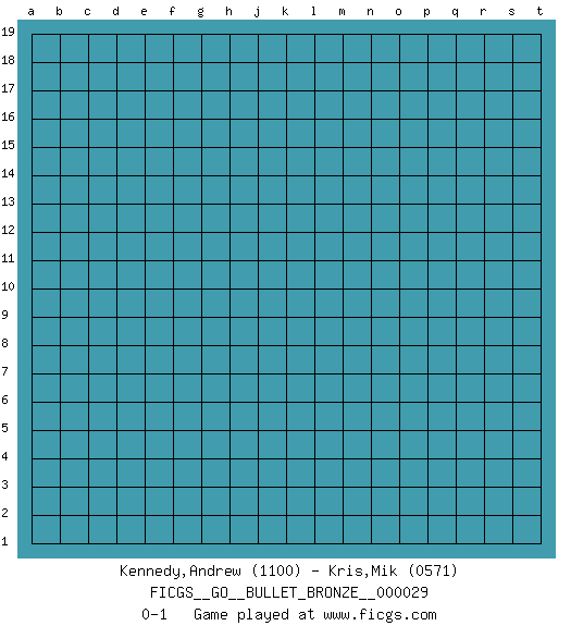 Last move : 0-1 2009 March 3 22:8:45 [Event "FICGS__GO__BULLET_BRONZE__000029"] [Site "FICGS"] [Date "2009.03.03"] [Round "1"] [Black "Kennedy,Andrew"] [White "Kris,Mik"] [Result "0-1"] [Rating 1 "1100"] [Rating 2 "0571"] 0-1 This go game has been lost on time (started : 2009.03.03 15:12:25) Comment by player 2 : Mik Kris : man i am realy sorry i thoght he was online Here are the names of the openings (joseki) played in the four corners : Player White won this Go (weiqi, baduk) game. Follow this game move after move (download)In an unreasonable situation, an unreasonable move is reasonable. (Tamino) May I never be complete. May I never be content. May I never be perfect. Deliver me, Tyler, from being perfect and complete. (Chuck Palahniuk, Fight Club)