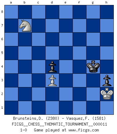 Last move : 1-0 2007 May 1 12:31:46 [Event "FICGS__CHESS__THEMATIC_TOURNAMENT__000011"] [Site "FICGS"] [Date "2006.09.04"] [Round "1"] [White "Brunsteins,Daniel"] [Black "Vasquez,Fernando"] [Result "1-0"] [WhiteElo "2380"] [BlackElo "1581"] 1.e4 e5 2.Nf3 f5 3.exf5 Nf6 4.Nxe5 Qe7 5.Qe2 d6 6.Nf3 Nc6 7.Qxe7+ Bxe7 8.Bb5 Bxf5 9.d3 a6 10.Bxc6+ bxc6 11.O-O Nd5 12.Bg5 Bxg5 13.Nxg5 Rb8 14.Re1+ Kd7 15.b3 Rbe8 16.Ne4 Nb4 17.Re2 c5 18.Nbc3 Nc6 19.Ng3 Bg6 20.Rc1 Nd4 21.Rxe8 Rxe8 22.f3 c6 23.Kf2 d5 24.Nce2 Ne6 25.Nf1 Kd6 26.Ne3 Nd4 27.Nf4 Nf5 28.Re1 Nxe3 29.Rxe3 Bf7 30.Rxe8 Bxe8 31.h4 h6 32.g4 Ke5 33.Ne2 g5 34.h5 Bf7 35.c3 d4 36.f4+ gxf4 37.c4 Bg8 38.Kf3 Bh7 39.Nxf4 a5 40.a3 Kf6 41.Ke2 Kg5 42.Ne6+ Kxg4 43.Nxc5 Kxh5 44.b4 axb4 45.axb4 Kg4 46.b5 cxb5 47.cxb5 Bg8 48.b6 Bd5 49.b7 Bxb7 50.Nxb7 h5 51.Kf2 h4 52.Kg2 h3+ 53.Kh2 1-0 Latvian counter-gambit Kingside Castling by player White (move 11) 10 pieces endgame at move 45 : White KNPPP , Black KBPPP WHITE : King + 1 Knight 3 Pawns BLACK : King + 1 Bishop 3 Pawns 9 pieces endgame at move 46 : White KNPP , Black KBPPP WHITE : King + 1 Knight 2 Pawns BLACK : King + 1 Bishop 3 Pawns 8 pieces endgame at move 47 : White KNPP , Black KBPP WHITE : King + 1 Knight 2 Pawns BLACK : King + 1 Bishop 2 Pawns 7 pieces endgame at move 49 : White KNP , Black KBPP WHITE : King + 1 Knight 1 Pawn BLACK : King + 1 Bishop 2 Pawns 6 pieces endgame at move 50 : White KNP , Black KPP WHITE : King + 1 Knight 1 Pawn BLACK : King + 2 Pawns Player White won this chess game. Follow this game move after move (download)Spassky will not be psyched out by Fischer. (Mike Goodall) Die Leute spielen gegen mich seit 15 Jahren unter Ihren Möglichkeiten. (Robert James Fischer) Yo no le temo a Spassky. Todos saben que yo soy el mejor. Uno no necesita un torneo para probarlo. (Bobby Fischer) Les échecs, c'est l'art d'analyser. (Mikhail Botvinnik) Work expands to fill the time available. (C. Northcote Parkinson, in Parkinson's Laws)