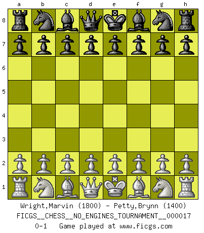 Last move : 0-1 2009 April 16 14:53:19 [Event "FICGS__CHESS__NO_ENGINES_TOURNAMENT__000017"] [Site "FICGS"] [Date "2009.03.07"] [Round "1"] [White "Wright,Marvin"] [Black "Petty,Brynn"] [Result "0-1"] [WhiteElo "1800"] [BlackElo "1400"] 0-1 This chess game has been lost on time (started : 2009.03.07 10:3:12) Player Black won this chess game. Follow this game move after move (download)I'm not afraid of Spassky. The world knows I'm the best. You don't need a match to prove it. (Bobby Fischer) Ich weiss nicht was Gott gegen mich auf 1.e4 antworten würde. (Robert James Fischer) Puntos débiles o agujeros en la posición de tu oponente deben de ser ocupados por piezas, no Peones. (Siegbert Tarrasch) La vie et les Echecs sont tous les deux une lutte constante. (Lasker) Internet: Absolute communication, absolute isolation. (Paul Carvel)