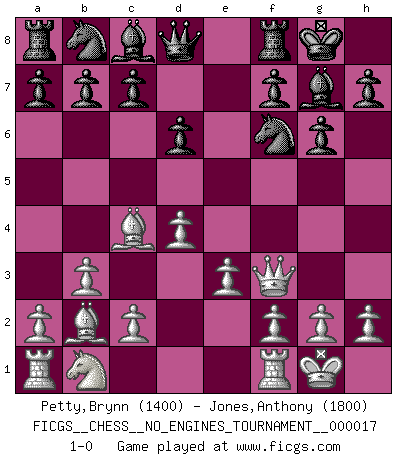 Last move : 1-0 2009 April 27 16:13:10 [Event "FICGS__CHESS__NO_ENGINES_TOURNAMENT__000017"] [Site "FICGS"] [Date "2009.03.07"] [Round "1"] [White "Petty,Brynn"] [Black "Jones,Anthony"] [Result "1-0"] [WhiteElo "1400"] [BlackElo "1800"] 1.d4 Nf6 2.Nf3 g6 3.e3 Bg7 4.Bd3 O-O 5.b3 d6 6.Bb2 e5 7.O-O e4 8.Bc4 exf3 9.Qxf3 1-0 This chess game has been lost on time (started : 2009.03.07 10:3:12) King's Indian : East Indian defense Kingside Castling by player Black (move 4) Kingside Castling by player White (move 7) Player White won this chess game. Follow this game move after move (download)No one ever won a game by resigning. (Unknown) Wenn ich mich einlogge, glauben die Leute gewöhnlich nicht, dass ich es selbst bin und sie fangen an, mir dumme Fragen zu stellen. Und wenn sie es glauben, stellen sie wieder andere dumme Fragen. (Judith Polgar) En el tablero, la mentira e hipocresía no sobreviven mucho. (Emanuel Lasker) Donnez-moi un Cavalier en 6e et je gagnerais toutes mes parties. (Steinitz) The ego is not master in its own house. (Sigmund Freud)