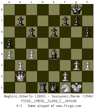 Last move : 0-1 2009 March 23 10:57:13 [Event "FICGS__CHESS__CLASS_C__000108"] [Site "FICGS"] [Date "2009.03.07"] [Round "1"] [White "Beghini,Alberto"] [Black "Soszynski,Marek"] [Result "0-1"] [WhiteElo "1800"] [BlackElo "1946"] 1.Nf3 d5 2.g3 Bg4 3.Bg2 Nd7 4.d4 e6 5.O-O Ngf6 6.b3 c6 7.Bb2 Bd6 8.Nbd2 O-O 9.Re1 Qc7 10.e4 Nxe4 11.Nxe4 dxe4 12.Rxe4 Nf6 13.Re1 Rfd8 14.Qd3 a5 15.a4 Bf5 16.Qd1 h6 17.c4 Bb4 18.Re2 Rac8 19.Ne5 Qb6 20.h3 Qa7 21.Ba3 Bxa3 22.Rxa3 Rxd4 23.Rd2 Rxd2 24.Qxd2 Qc5 25.Qb2 Rd8 26.Ra1 Ne4 27.Bxe4 Bxe4 28.Re1 Rd4 29.Ng4 Qb4 30.Ne3 Qxe1+ 31.Nf1 Rd1 0-1 Reti : King's Indian attack, Keres variation Kingside Castling by player White (move 5) Kingside Castling by player Black (move 8) Player Black won this chess game. Follow this game move after move (download)He who takes the Queen's Knight's Pawn will sleep in the streets. (Anonymous) Ich könnte leicht behaupten: Ja,ja, Leonid Breschnew wollte nicht, daß ich Weltmeister werde. In der Tat war die Sache komplizierter. (Viktor Kortschnoi) El Ajedrez no es como la vida... ¡tiene reglas!. (Mark Pasternak) Horreur, mais aussi harmonie suprême : qu'y avait-il en effet au monde en dehors des échecs ? Le brouillard, l'inconnu, le non-être... (Vladimir Nabokov) The arrogant army will lose certainly the battle. (Chinese proverb)