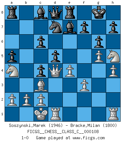Last move : 1-0 2009 March 31 21:42:29 [Event "FICGS__CHESS__CLASS_C__000108"] [Site "FICGS"] [Date "2009.03.07"] [Round "1"] [White "Soszynski,Marek"] [Black "Bracke,Milan"] [Result "1-0"] [WhiteElo "1946"] [BlackElo "1800"] 1.e4 e5 2.d4 exd4 3.Qxd4 Nc6 4.Qe3 Nf6 5.Bd2 d6 6.Nc3 Be7 7.O-O-O O-O 8.f3 Re8 9.Nge2 a5 10.Nf4 Ne5 11.g4 c6 12.g5 Nfd7 13.h4 b5 14.Nh5 Nc4 15.Bxc4 bxc4 16.Na4 d5 17.Bc3 g6 18.Qd4 1-0 Centre game : Berger variation Queenside Castling by player White (move 7) Kingside Castling by player Black (move 7) Player White won this chess game. Follow this game move after move (download)Let the perfectionist play postal. (Yasser Seirawan) Weshalb minderdergeübte Spieler mit g2-g4 beginnen? Die betreffenden sind unschlüssig, ob sie nun rechts (h4) oder links (f4) beginnen sollen, und in ihrer Ratlosigkeit entschliessen sie sich nach guter Bürgerart dazu, den goldenen Mittelweg zu wählen. (Aaron Nimzowitsch) El Ajedrez es sobre todo, ¡una pelea!. (Emanuel Lasker) Roi des jeux et jeu des rois, les échecs portent en eux un sentiment d'infini. Ils donnent à celui qui s'est efforcé d'en approfondir les arcanes l'impression de n'être pas à la mesure de l'homme; en fait, ils constituent un résumé de l'univers, un microcosme, et figurent cette grande échelle qui, dans les plans de la lumière descend jusqu'à la matière, qui des abîmes insondables remonte jusqu'en l'infini de Dieu. (Pyrame) If you are going through hell, keep going. (Winston Churchill)