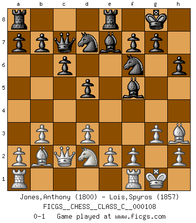 Last move : 0-1 2009 May 17 18:11:49 [Event "FICGS__CHESS__CLASS_C__000108"] [Site "FICGS"] [Date "2009.03.07"] [Round "1"] [White "Jones,Anthony"] [Black "Lois,Spyros"] [Result "0-1"] [WhiteElo "1800"] [BlackElo "1857"] 1.Nf3 Nf6 2.g3 d5 3.Bg2 Bf5 4.O-O e6 5.d3 c6 6.Nbd2 Nbd7 7.b3 h6 8.Bb2 Be7 9.c4 O-O 10.Qc2 Qc7 11.cxd5 exd5 12.Nd4 Bh7 13.Bh3 Rfe8 14.Nf5 Bxf5 0-1 Reti Opening Kingside Castling by player White (move 4) Kingside Castling by player Black (move 9) Player Black won this chess game. Follow this game move after move (download)Whoever sees no other aim in the game than that of giving checkmate to one's opponent will never become a good Chess player. (Euwe) Die Leute spielen gegen mich seit 15 Jahren unter Ihren Möglichkeiten. (Robert James Fischer) Creo que una cierta cantidad de temperamento es esperada de los genios del Ajedrez. (Ron Gross) Le moment que je préfère le plus dans une rencontre, c'est celui où je sens que la personnalité de l'adversaire se brise. (Robert Fischer) May I never be complete. May I never be content. May I never be perfect. Deliver me, Tyler, from being perfect and complete. (Chuck Palahniuk, Fight Club)